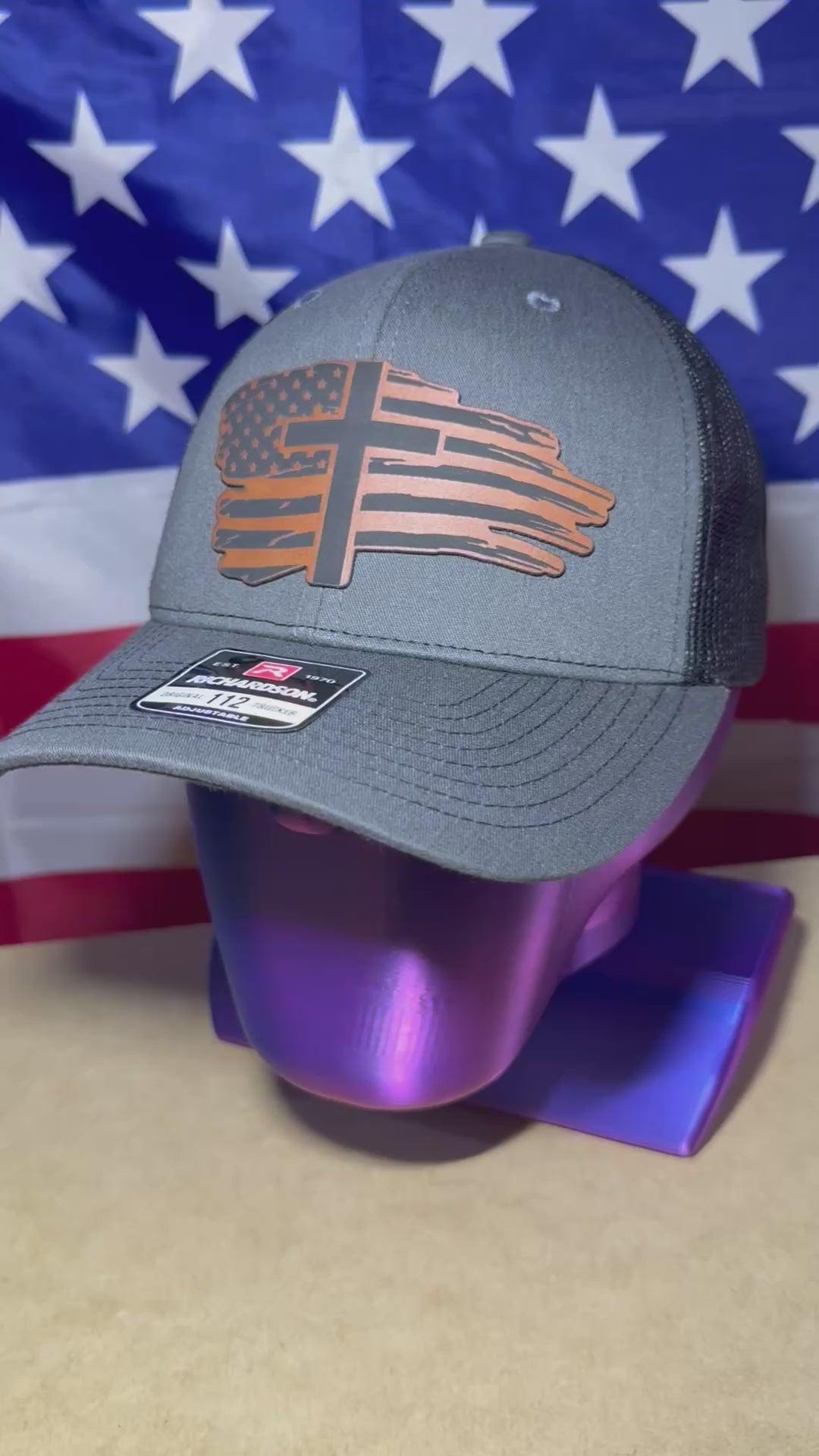 Please note: I typically stock the charcoal gray front with black back and the black front with charcoal gray back options, but this hat is also available in the stars & stripes hat and the navy front with Carmel back. Those options are not always in stock and may have a longer turnaround time. If you purchase either of those 2 colors, I will update you on the expected shipping time.