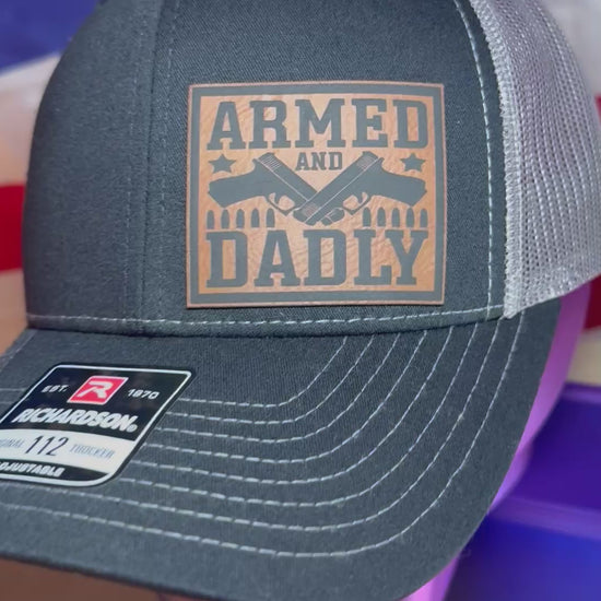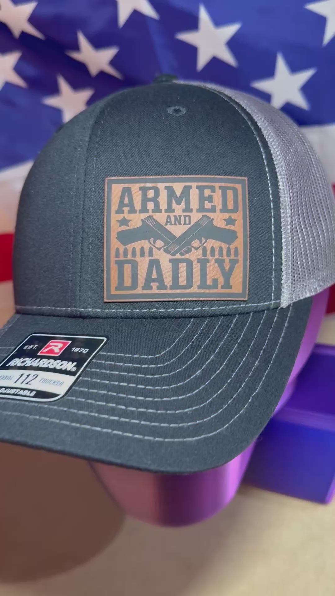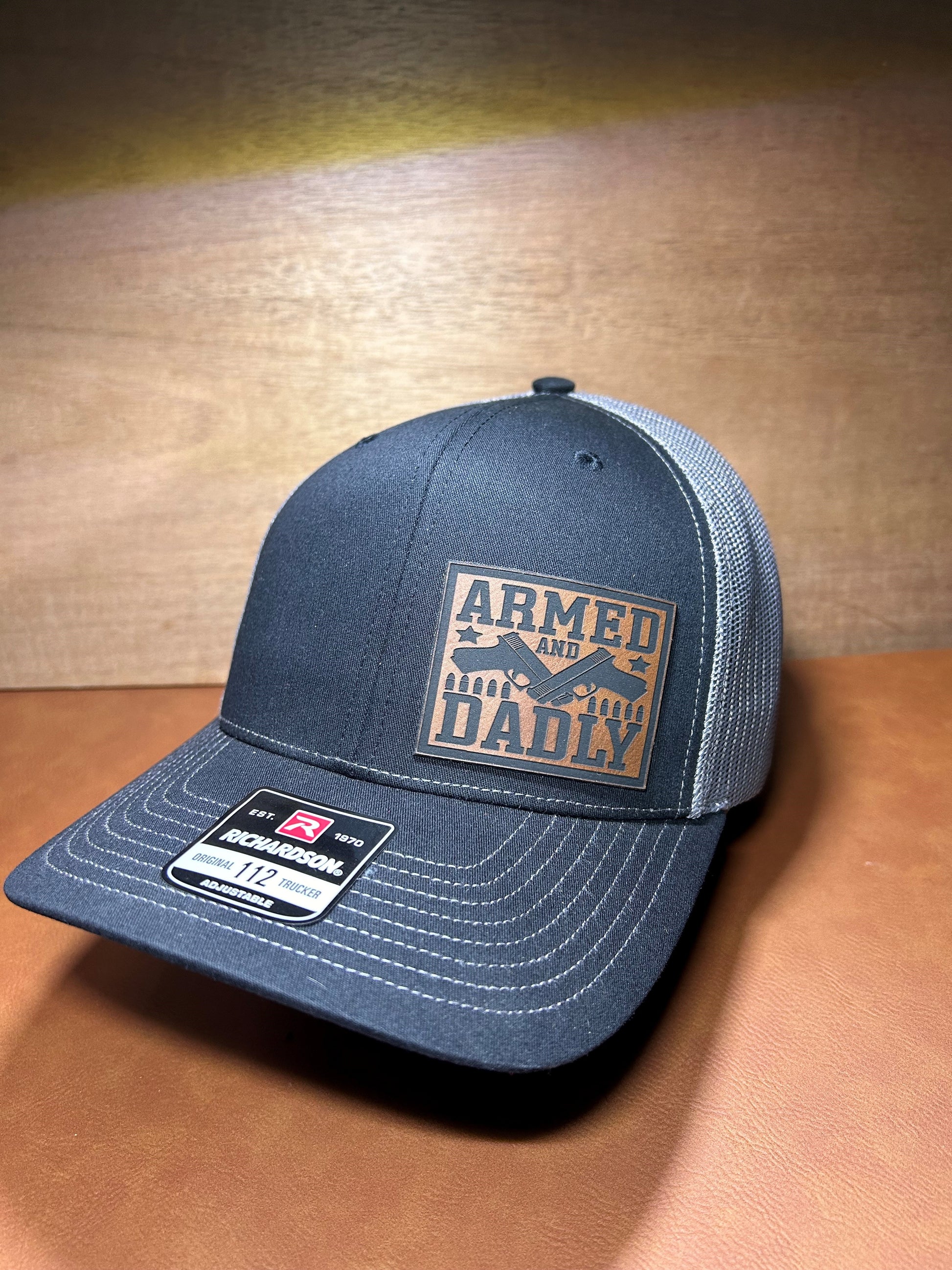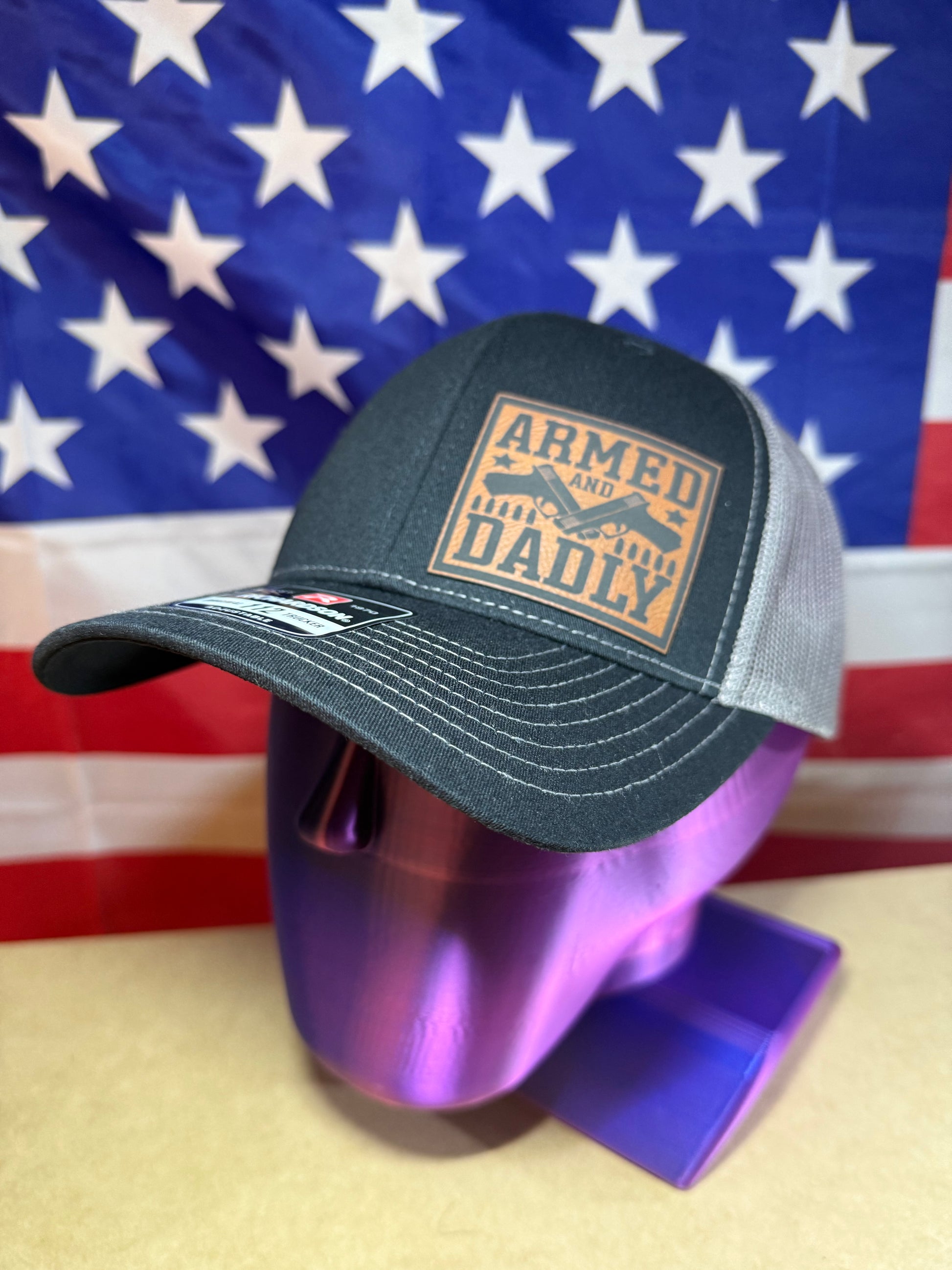 Richardson 112 snapback hat, the black front and charcoal back is pictured here. The patch is made of a brown leatherette material and a high quality adhesive.