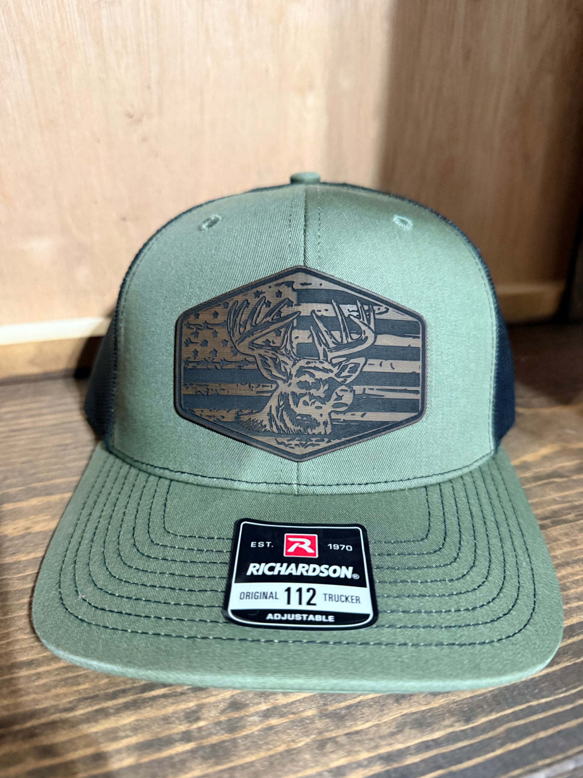Richardson 112 snapback hat, the Loren green front and black back is pictured here. The patch is made of a dark brown wood design leatherette material and a high-quality adhesive.
