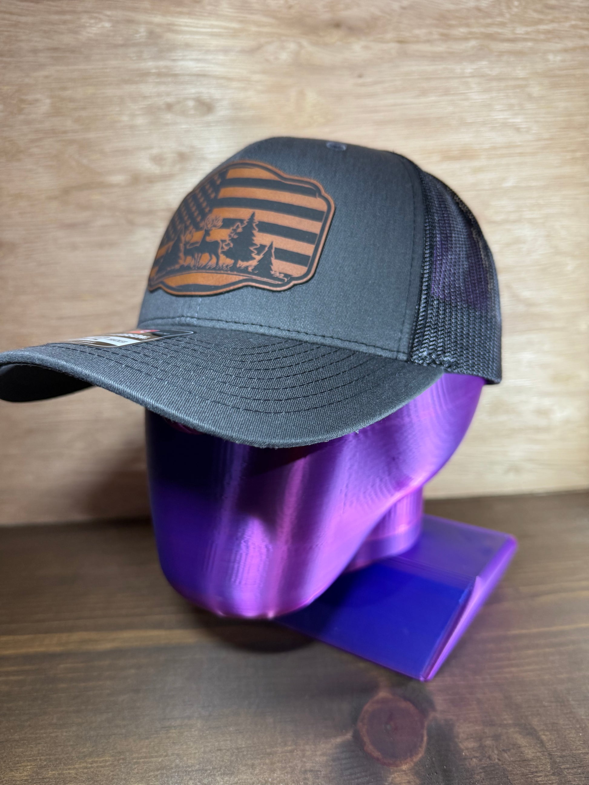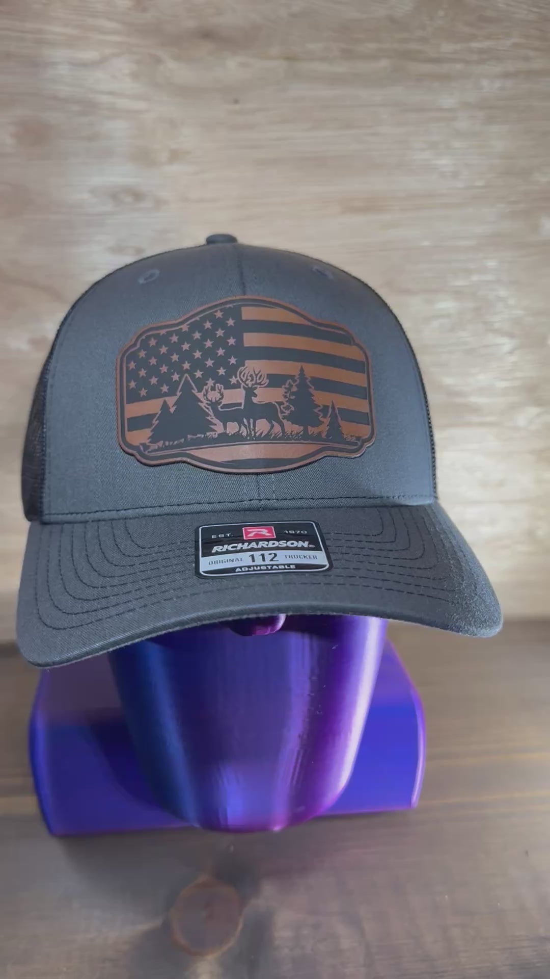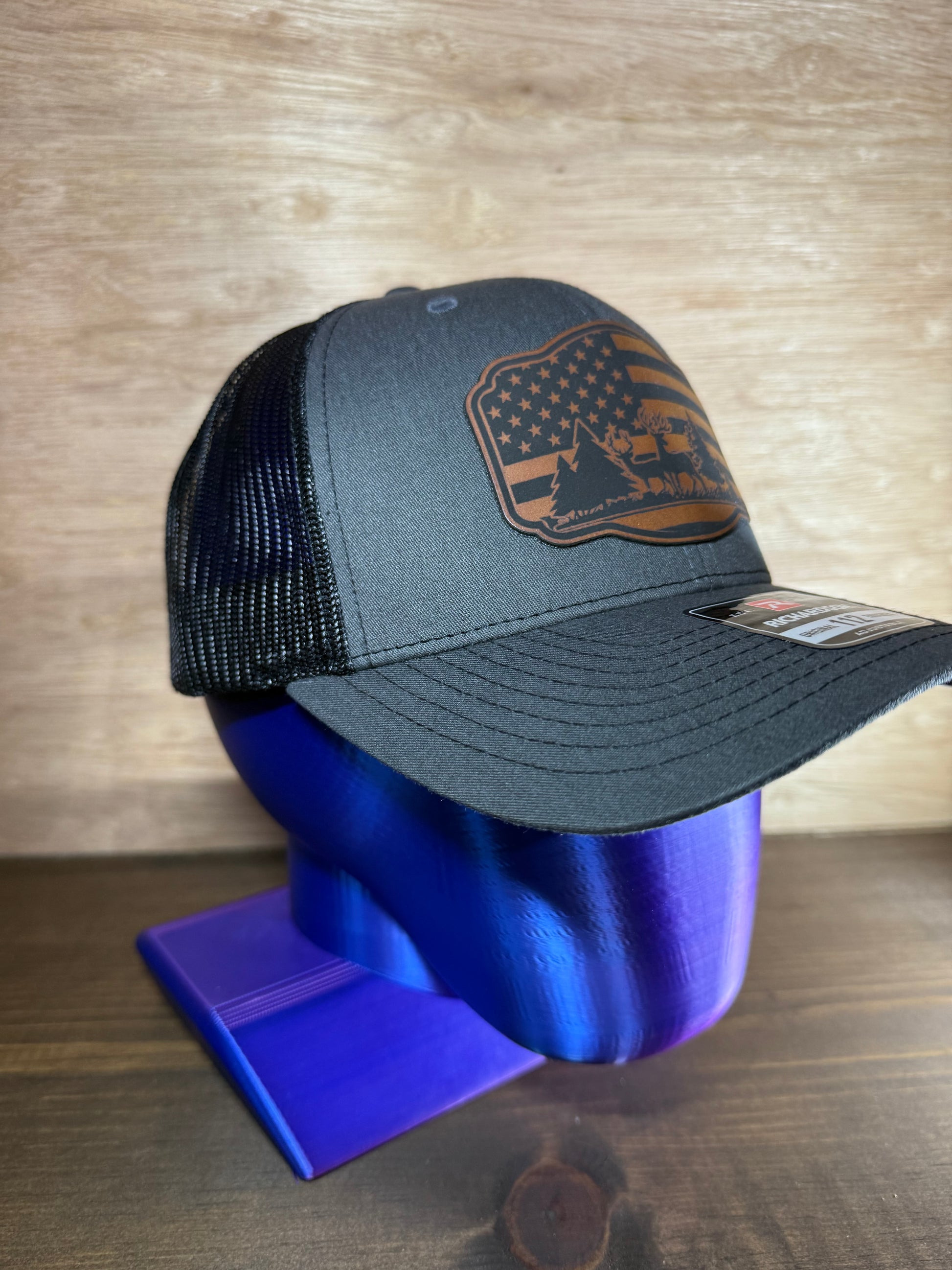 Richardson 112 snapback hat, the charcoal front and black back is pictured here. The patch is made of a brown leatherette material and a high-quality adhesive.