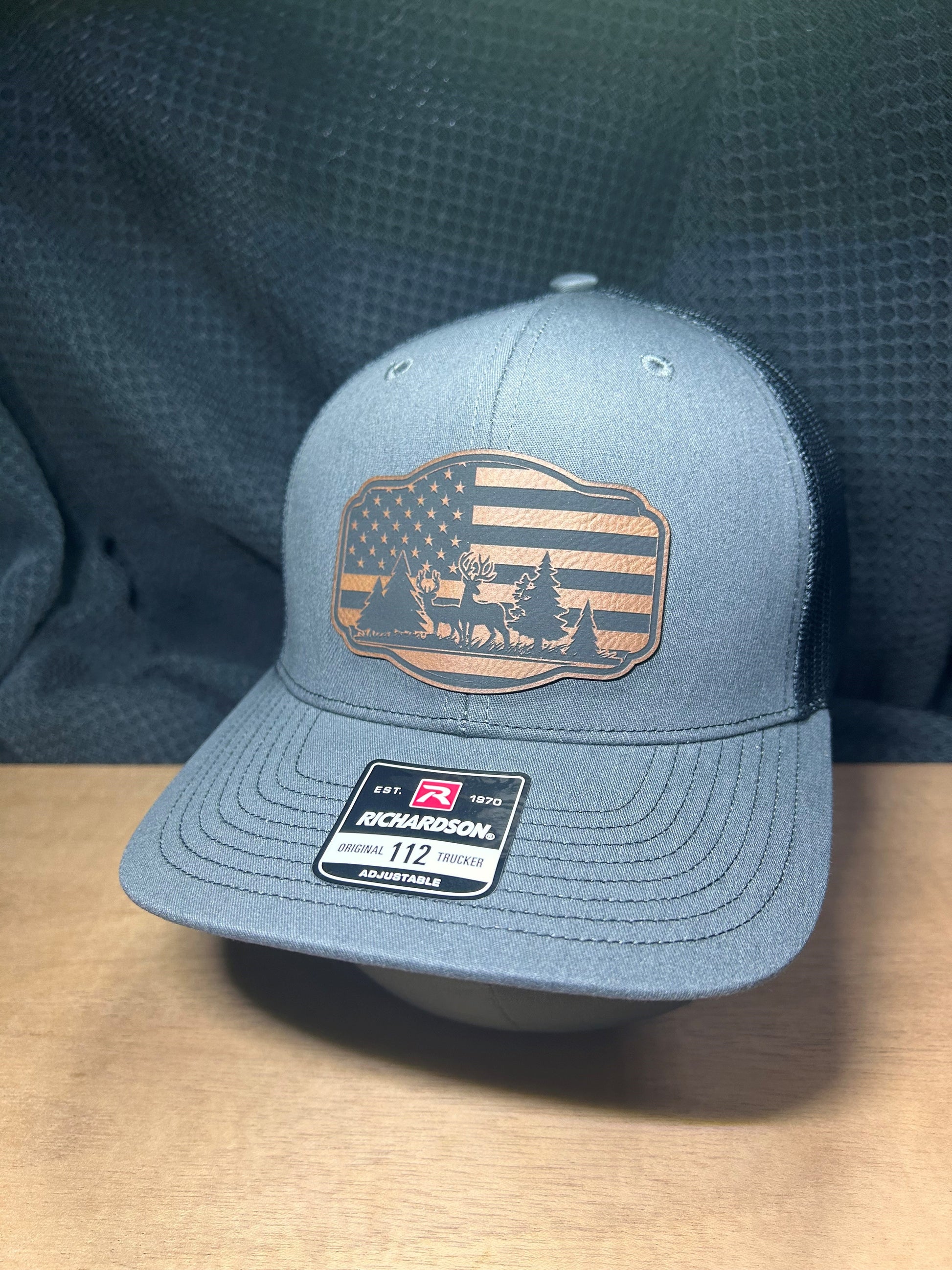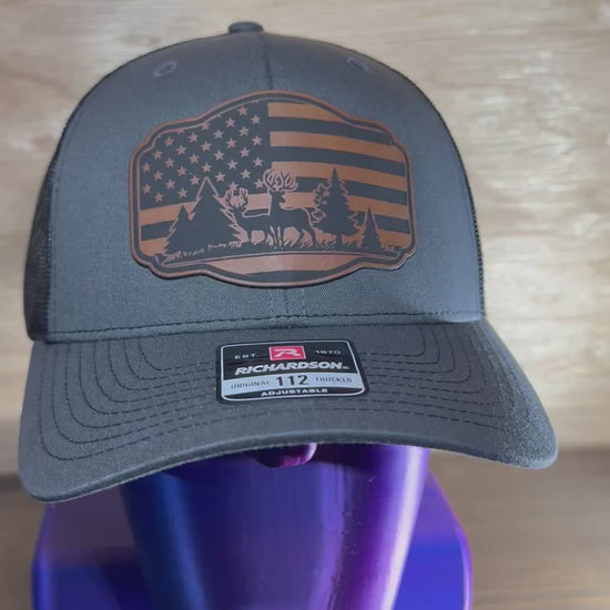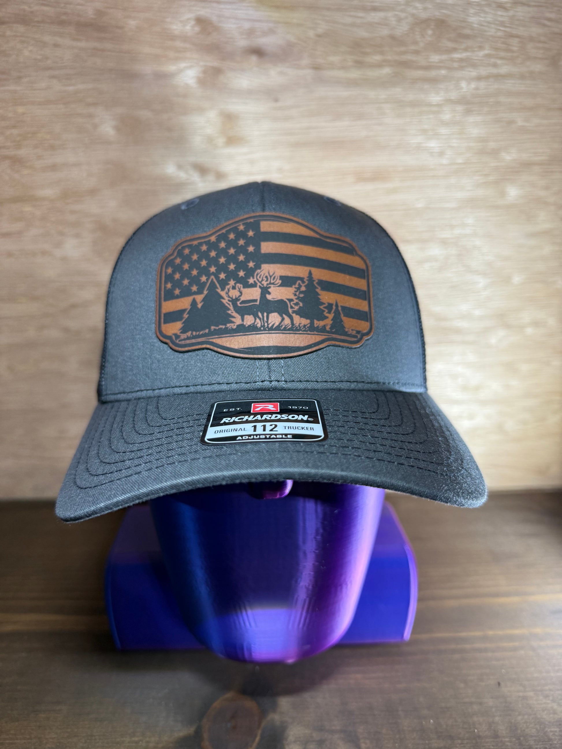 Richardson 112 snapback hat, the charcoal front and black back is pictured here. The patch is made of a brown leatherette material and a high-quality adhesive.