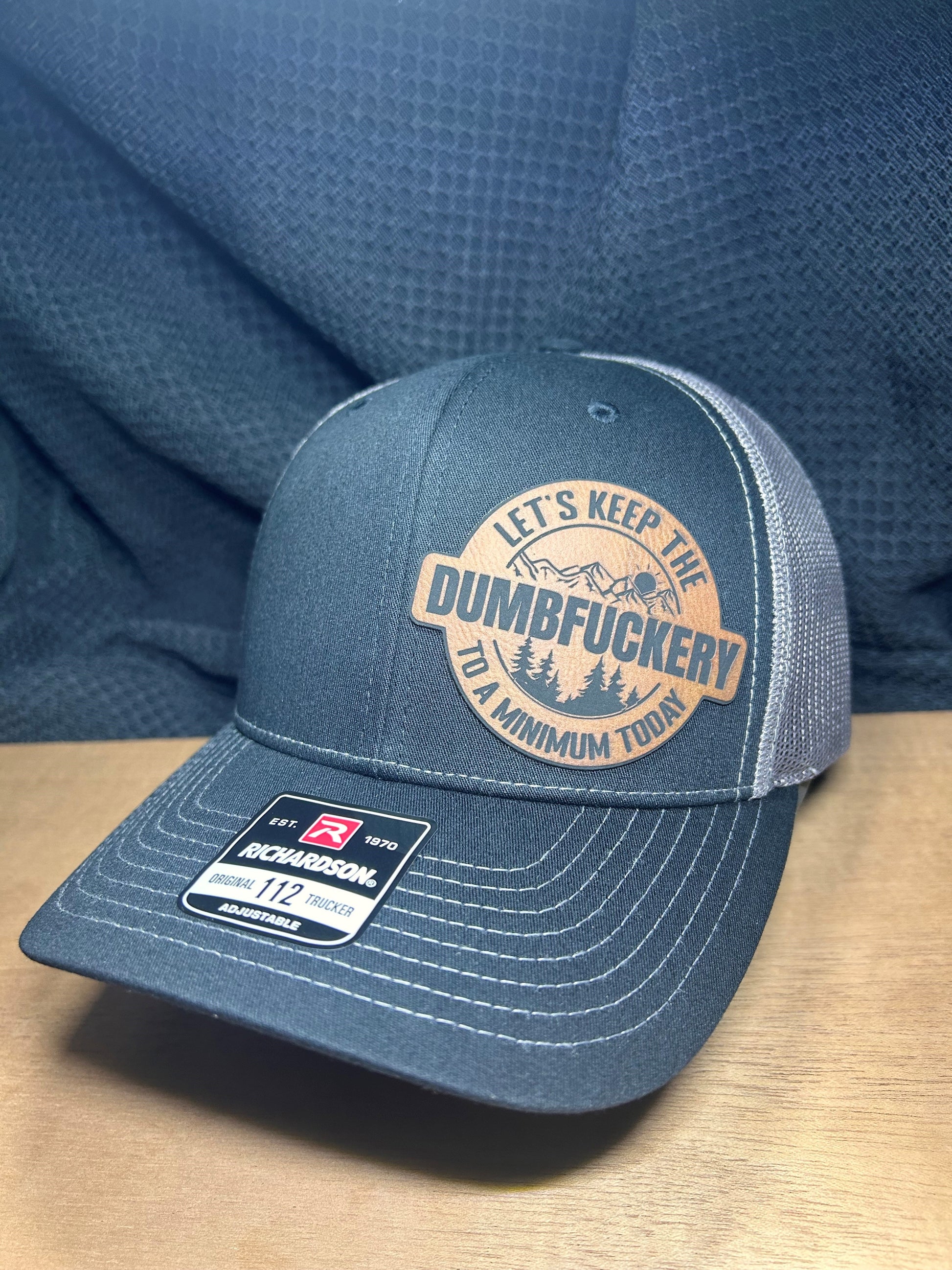 Richardson 112 snapback hat, the black front and charcoal back is pictured here. The patch is made of a brown leatherette material and a high-quality adhesive.