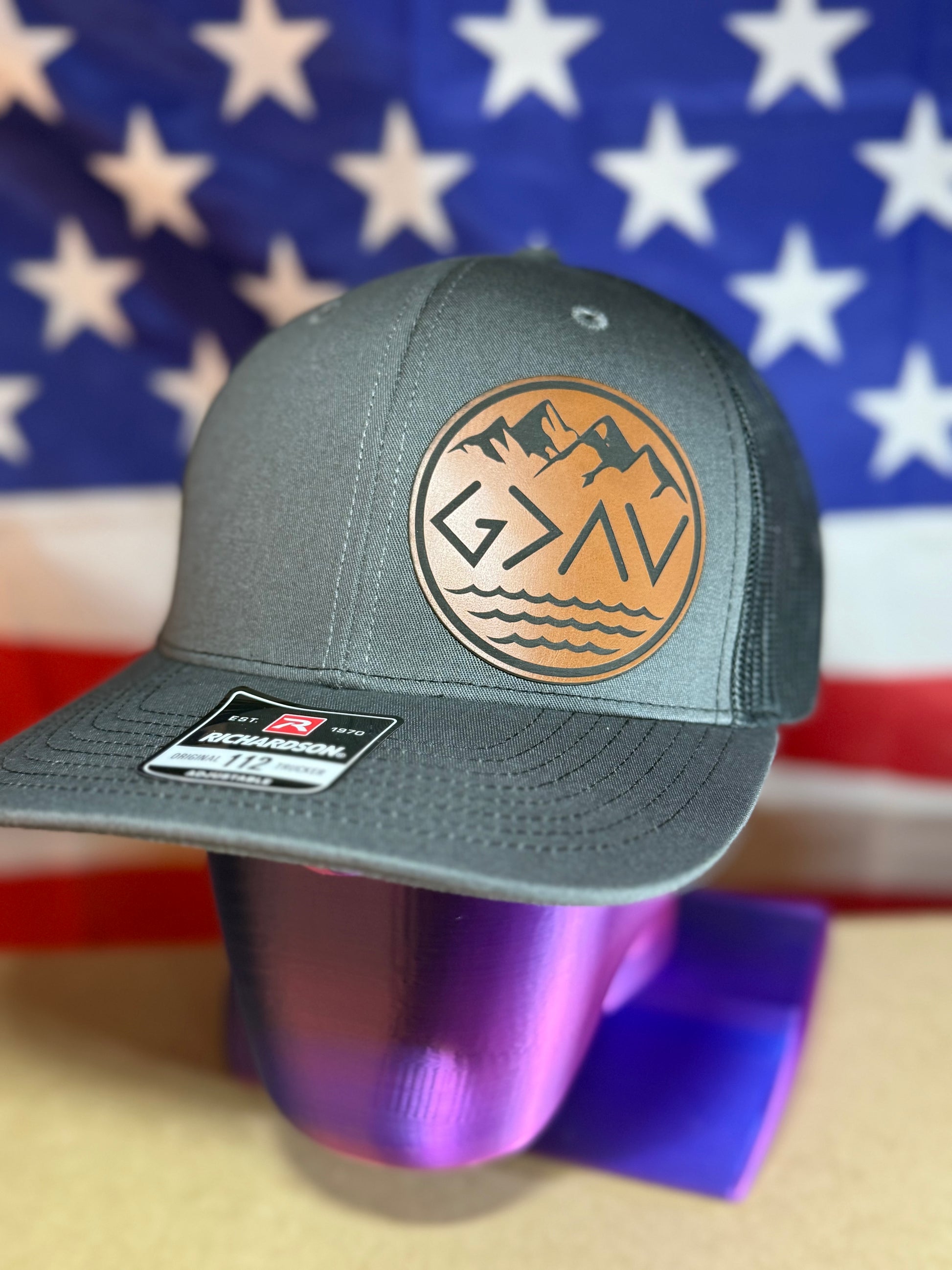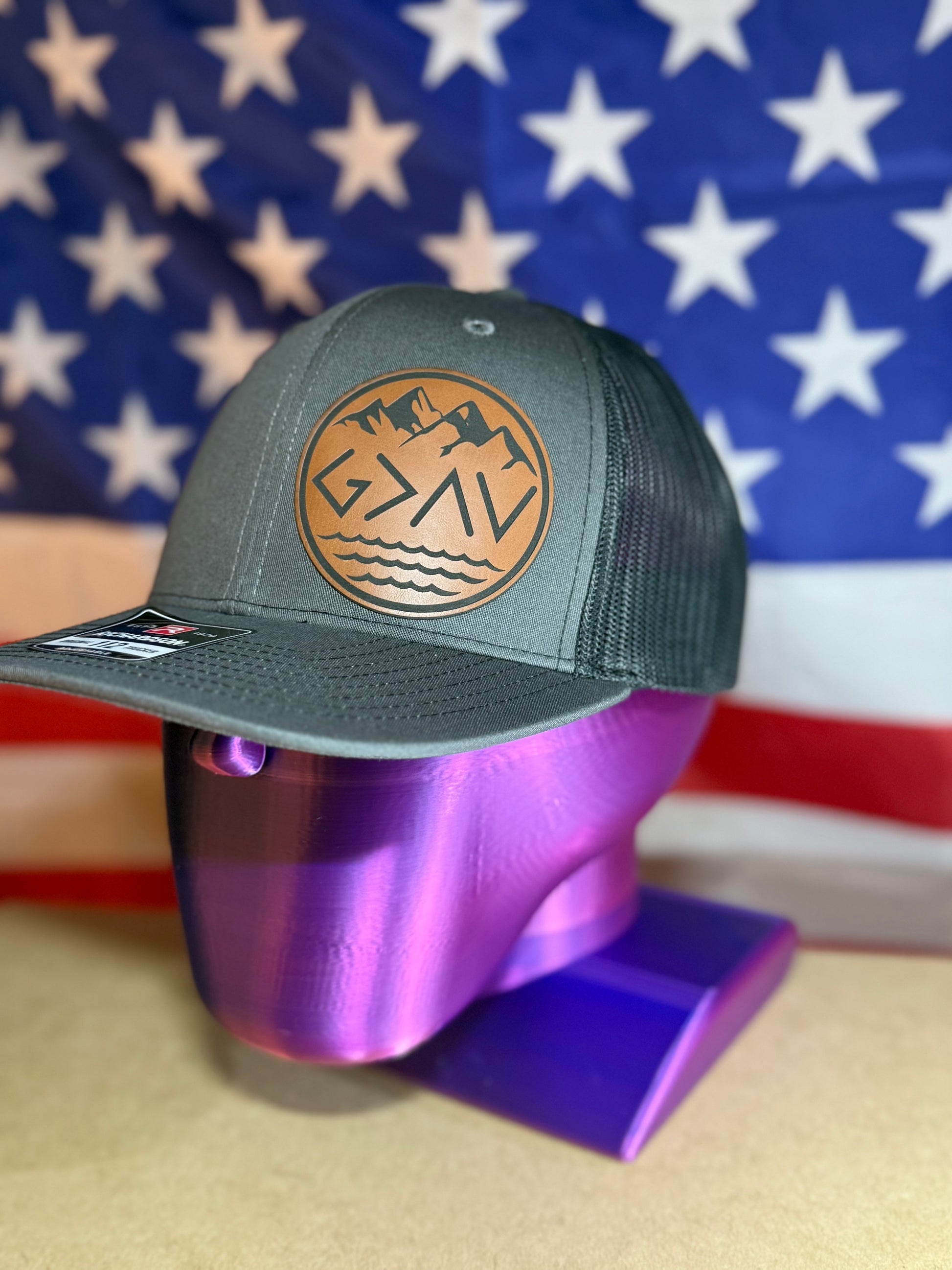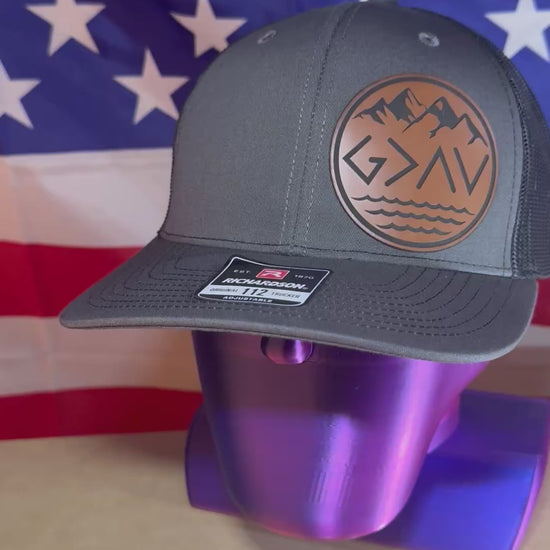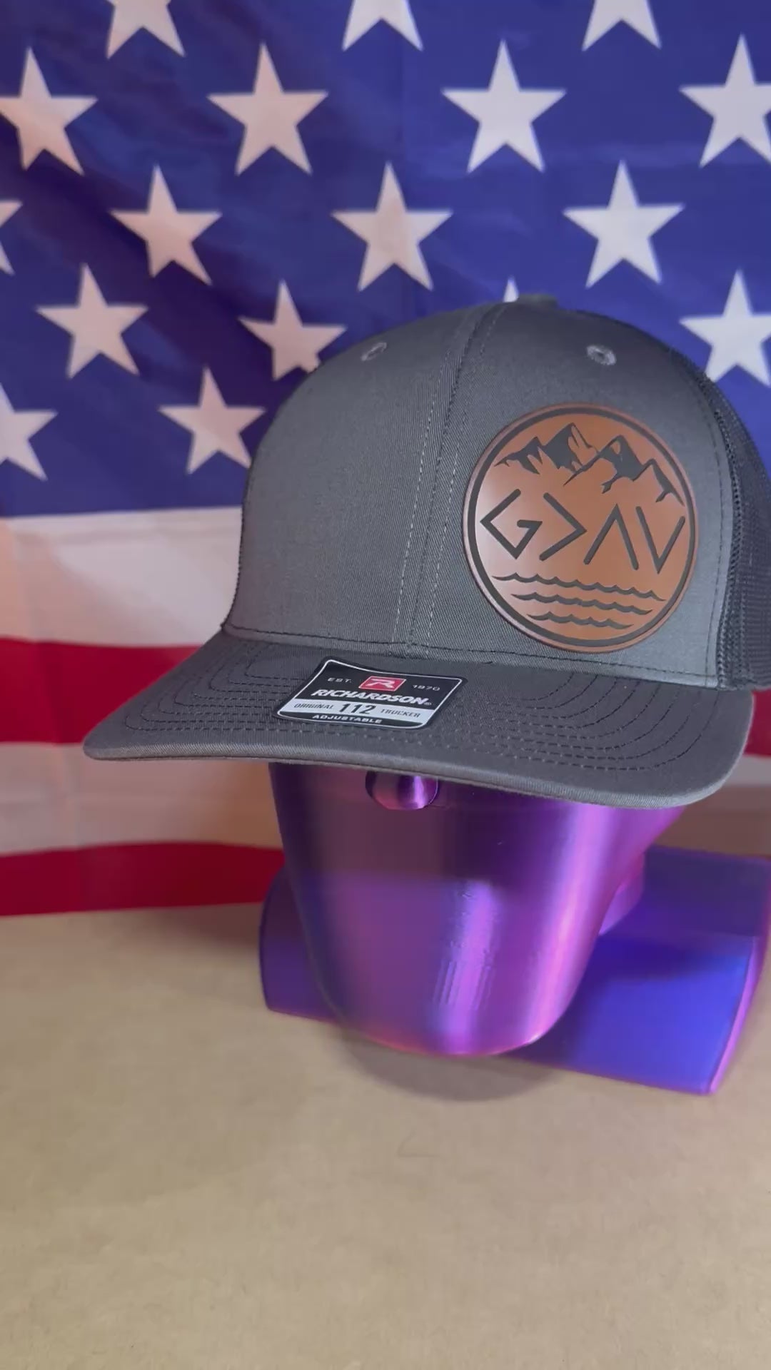 Richardson 112 snapback hat, the charcoal front and black back is pictured here. The patch is made of a brown leatherette material and a high-quality adhesive.