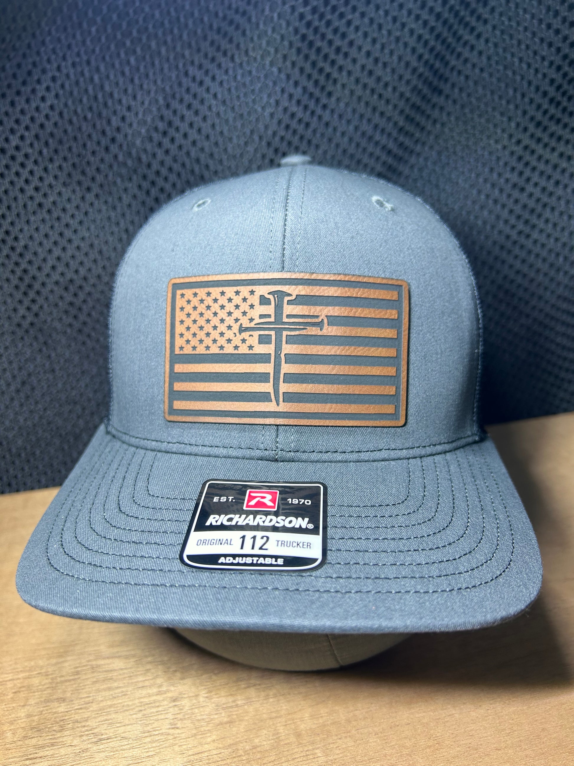 Richardson 112 snapback hat, the charcoal front and black back is pictured here. The patch is made of a brown leatherette material and a high-quality adhesive.