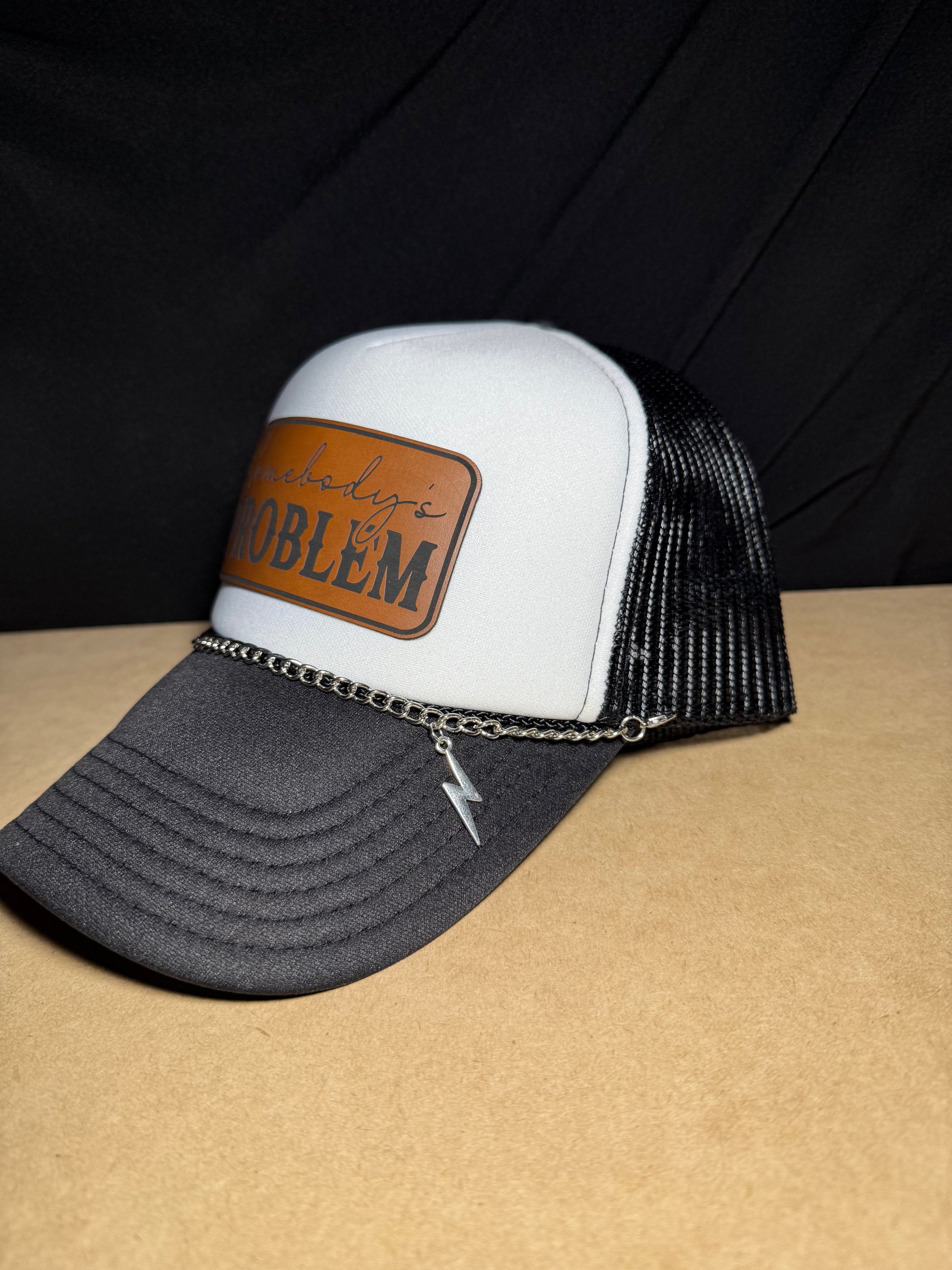 Super cute OTTO cap foam trucker hat. It comes with the hat chain and lightning charm seen here. The patch is made with a leatherette material backed with a high quality adhesive. Can be purchased solo or purchase the men’s “Somebody@ hat as a fun couples set.