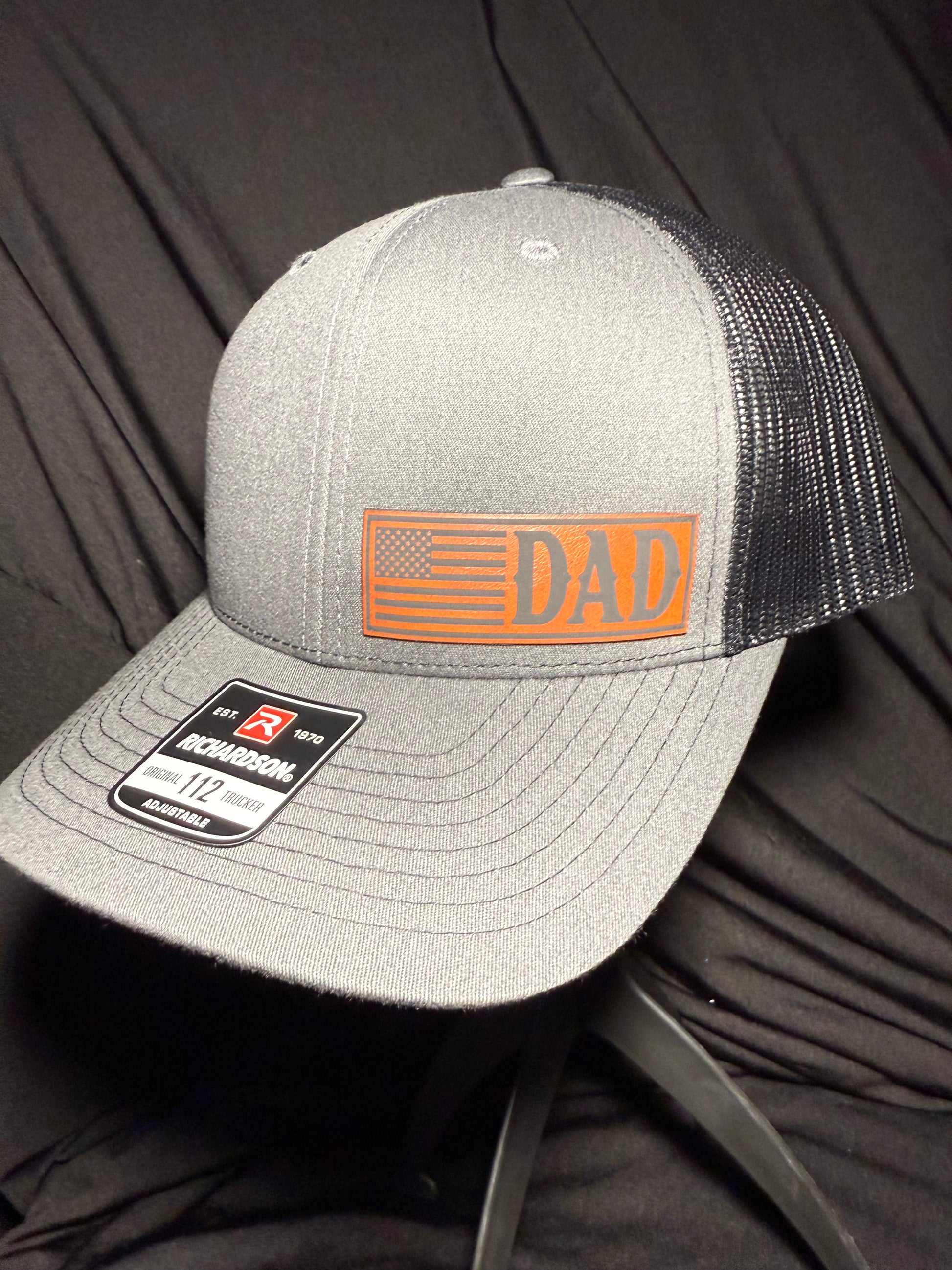 Richardson 112 snapback hat, the charcoal front and black back is pictured here. The patch is made of a brown leatherette material and a high quality adhesive.