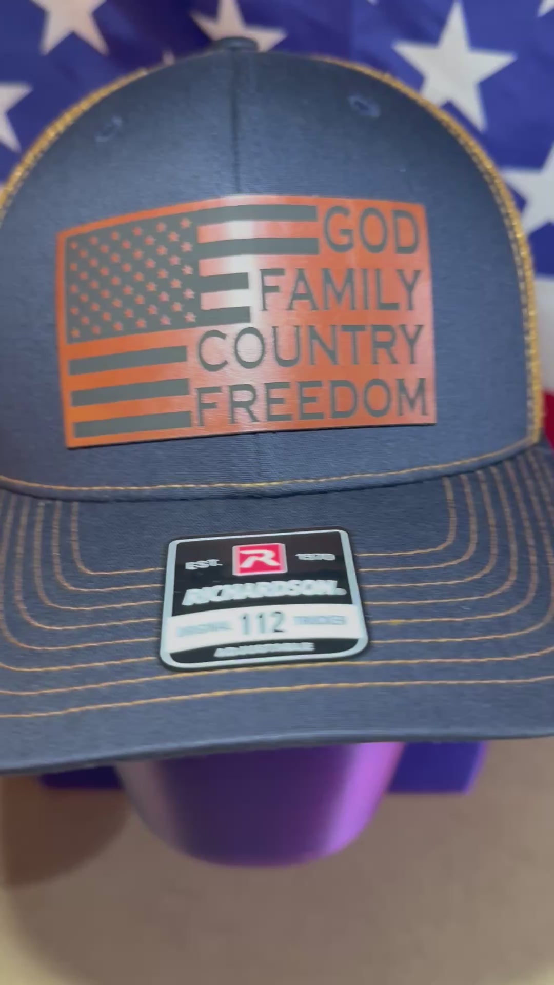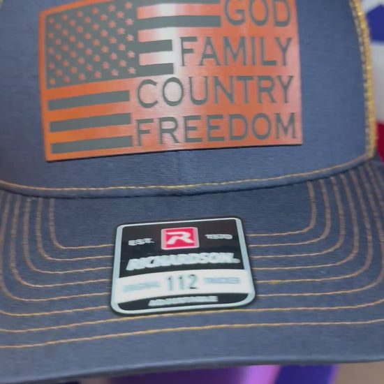 Richardson 112 snapback hat, the navy front and Carmel back is pictured here. Check out the other hat color options. The patch is made of a brown leatherette material and a high-quality adhesive.