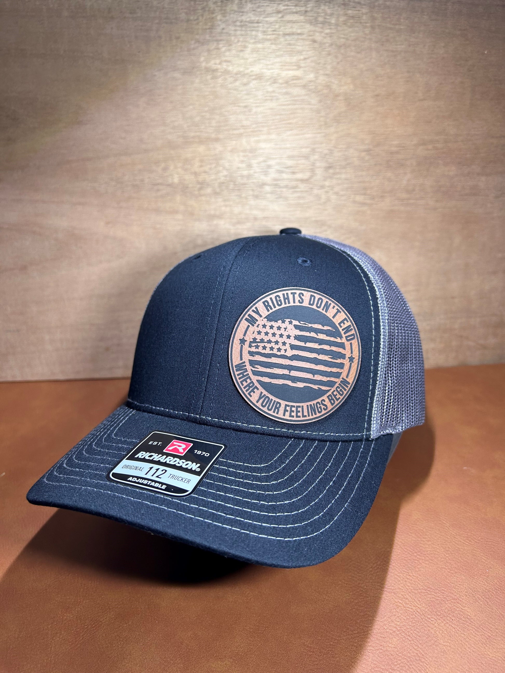 Richardson 112 snapback hat, the black front and charcoal back is pictured here. The patch is made of an all black leatherette material and a high quality adhesive.