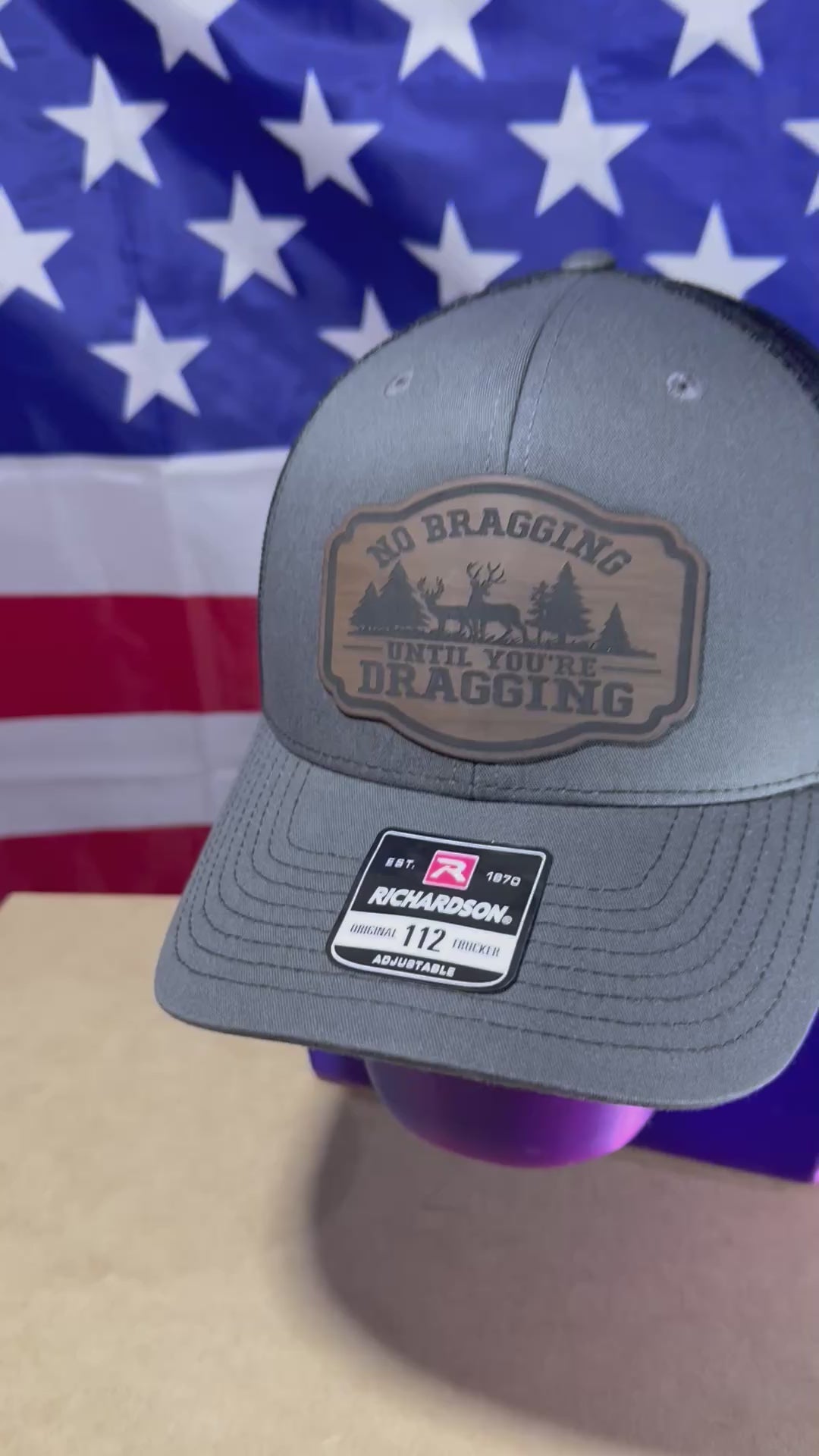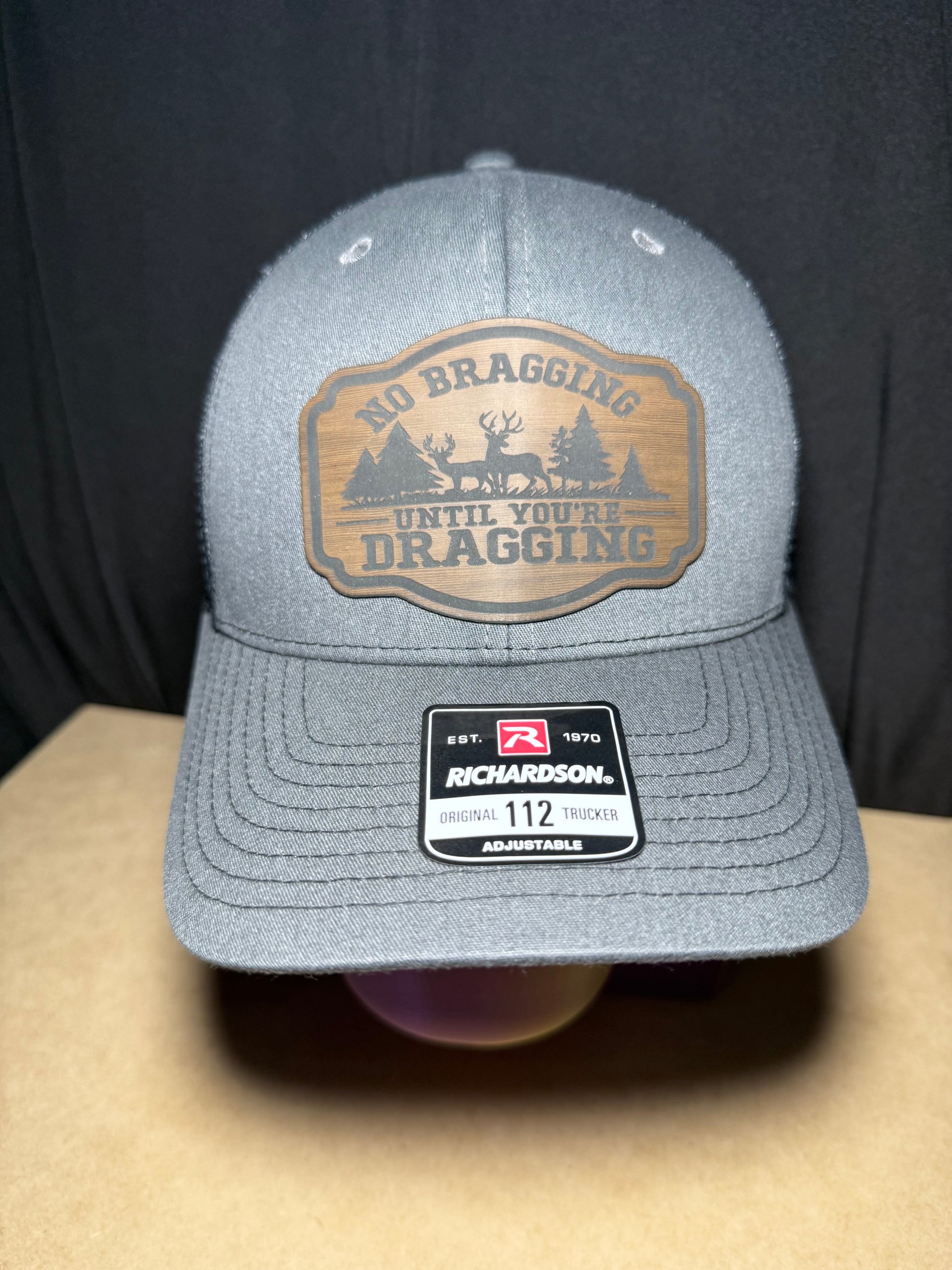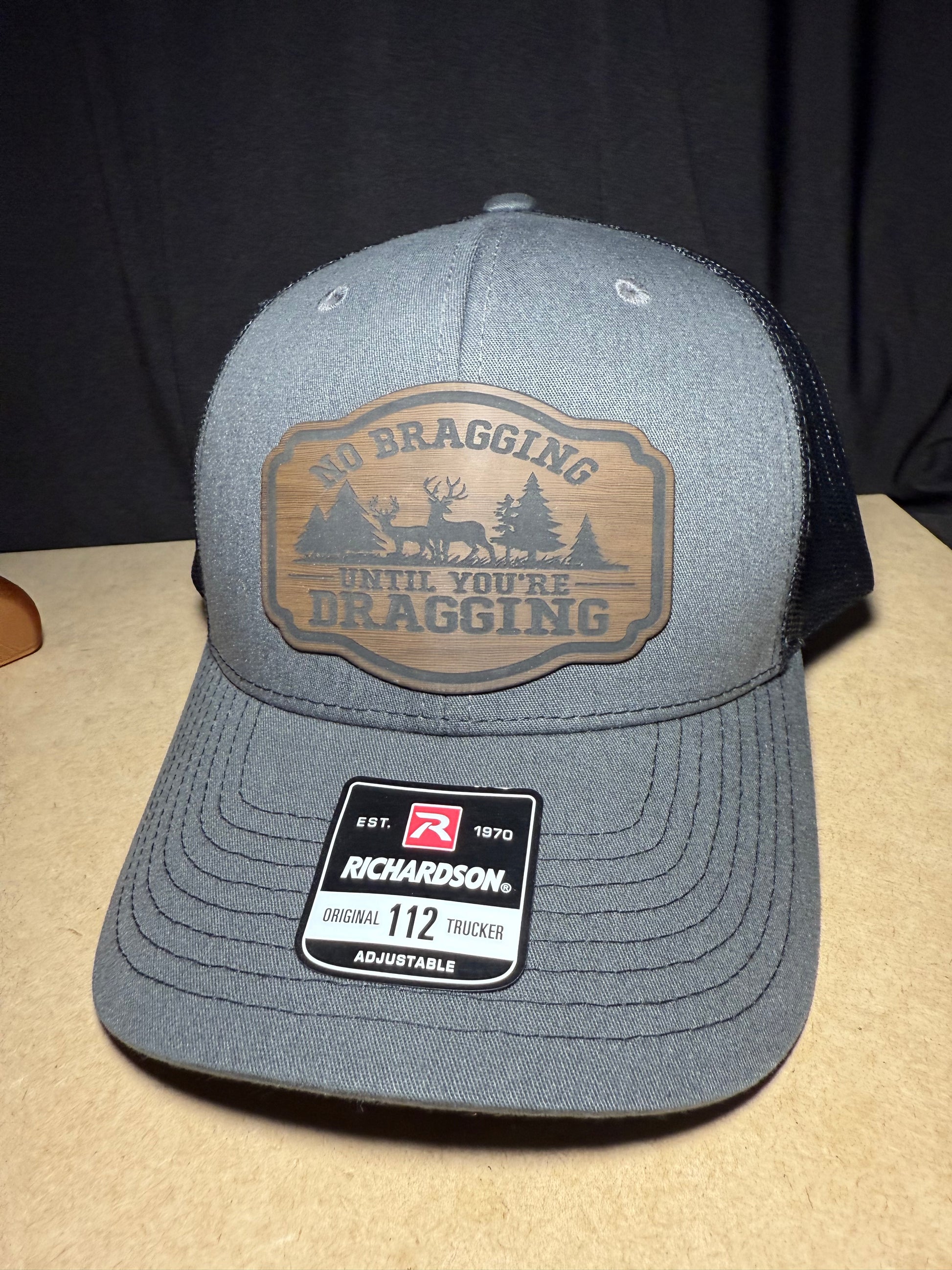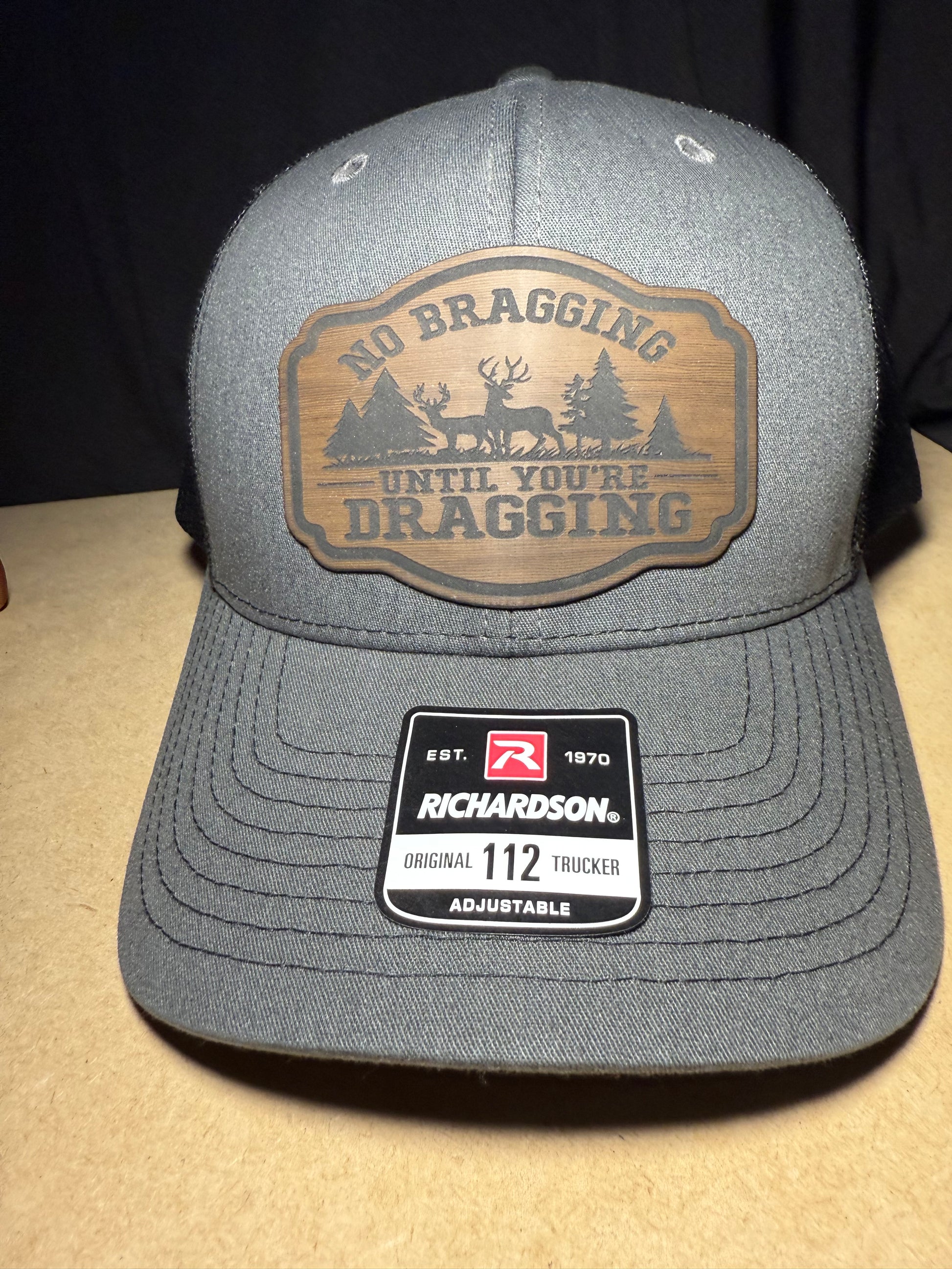Richardson 112 snapback hat, the charcoal front and black back is pictured here. The patch is made of a brown wood look leatherette material and a high-quality adhesive.