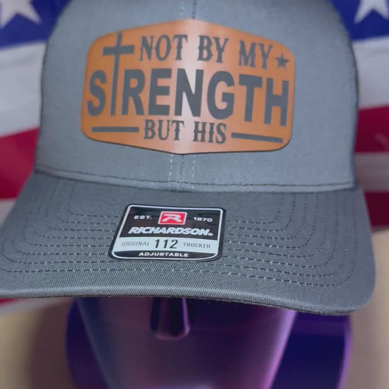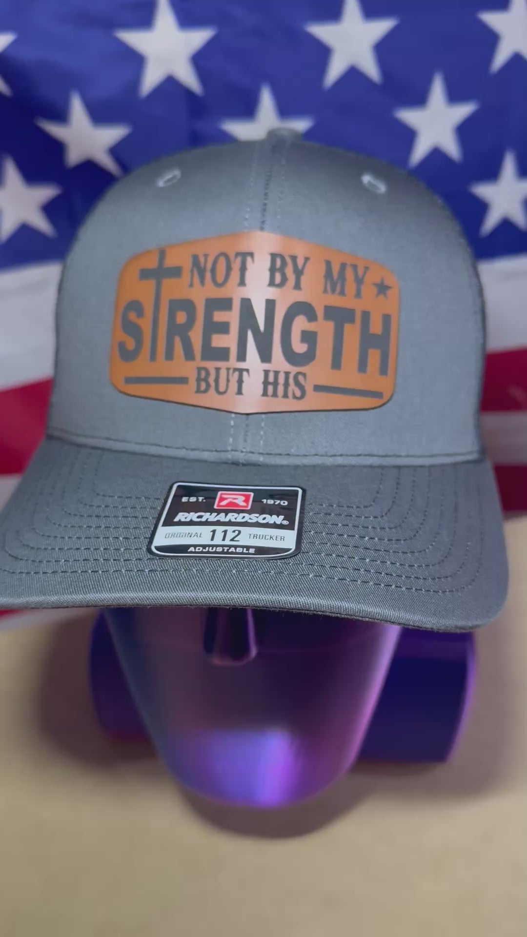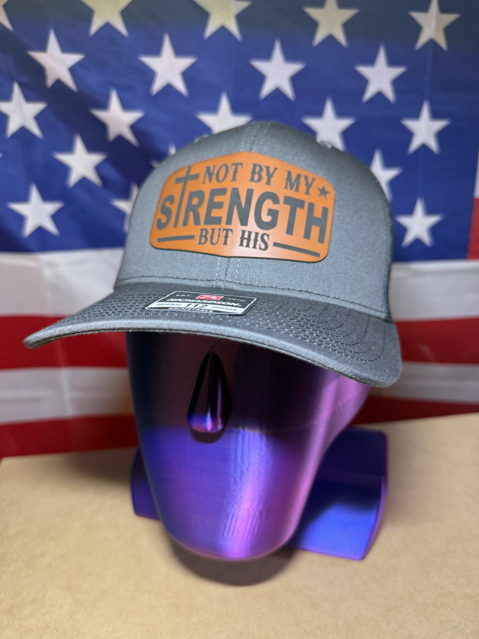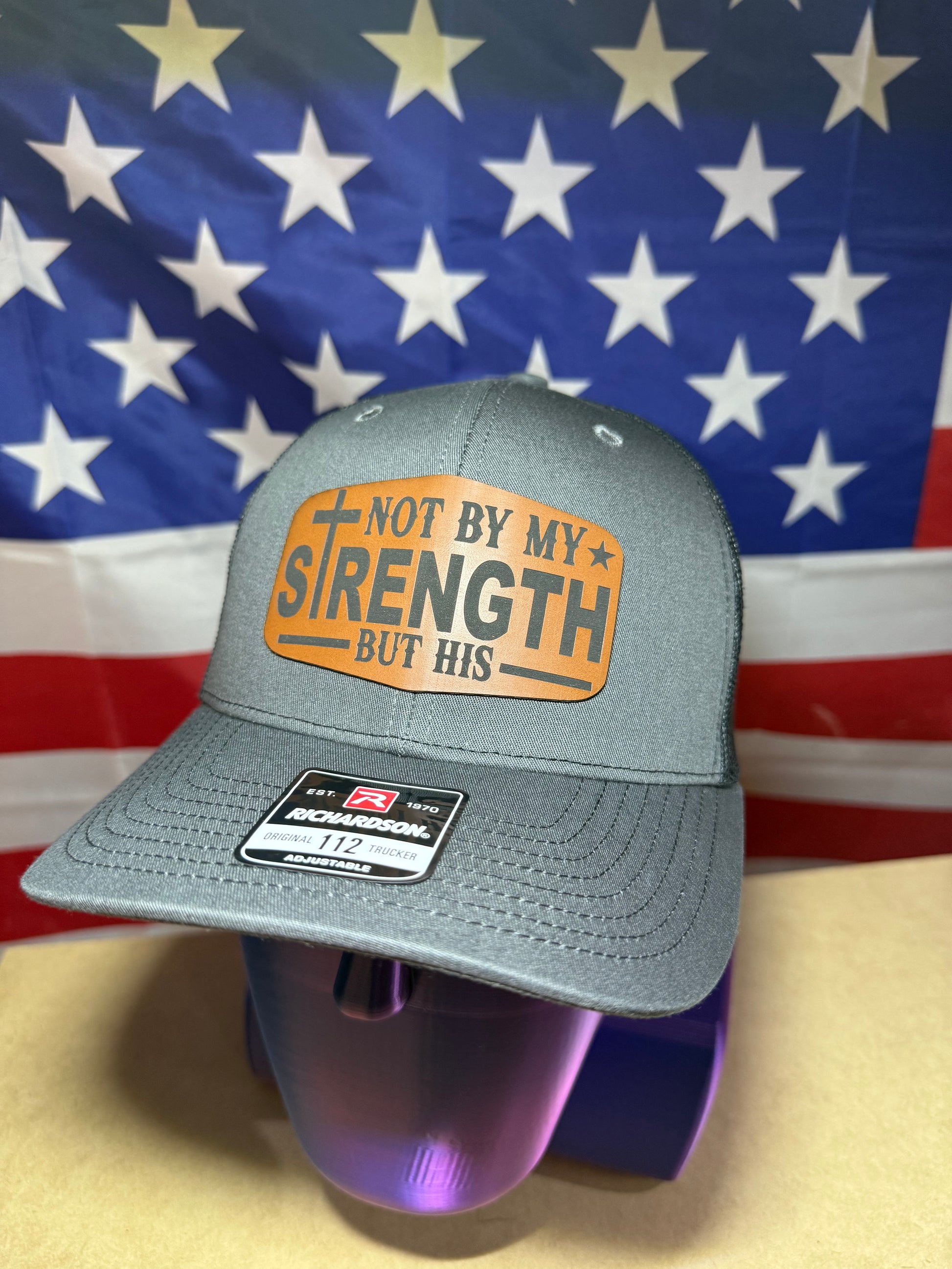 Richardson 112 snapback hat, the charcoal front and black back is pictured here. The patch is made of a brown leatherette material and a high-quality adhesive.