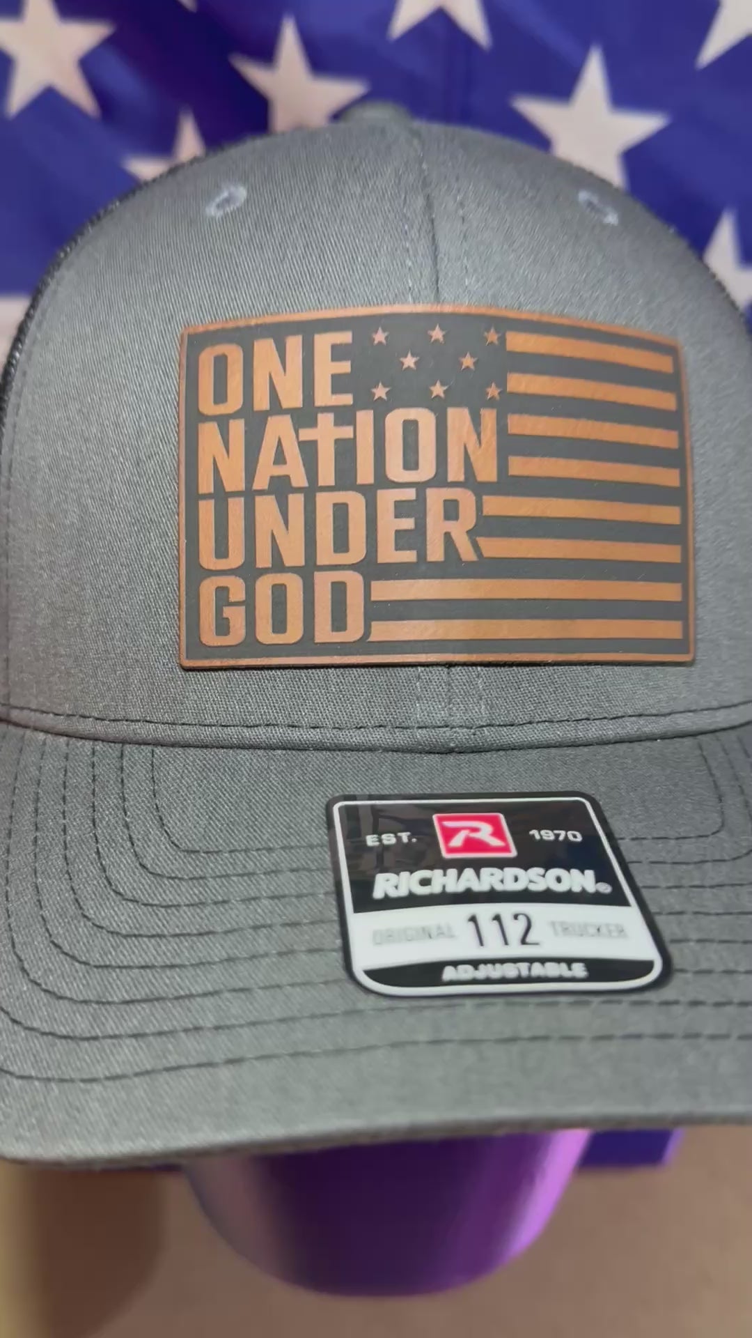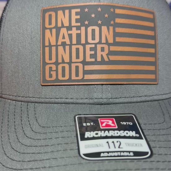 Richardson 112 snapback hat, the charcoal front and black back is pictured here. The patch is made of a brown leatherette material and a high-quality adhesive.