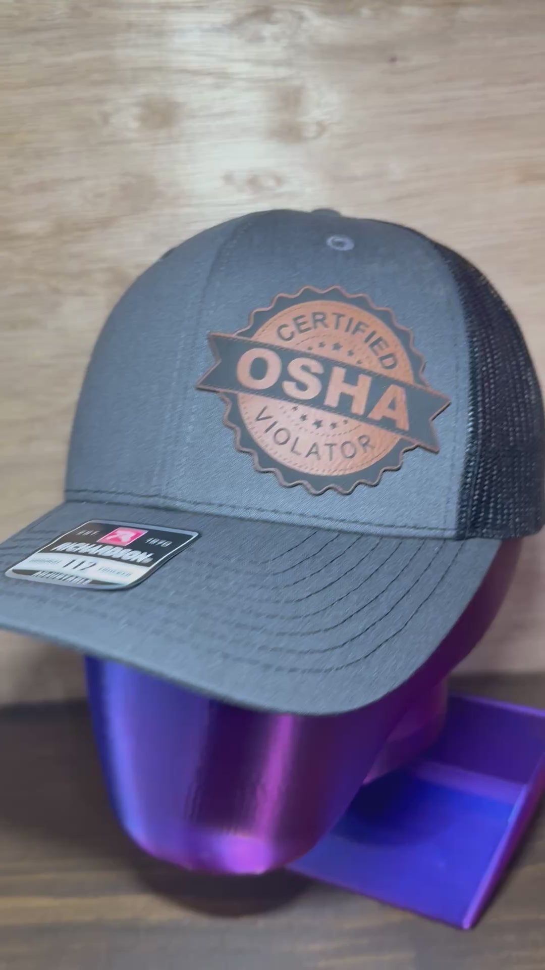 Richardson 112 snapback hat, the charcoal front and black back is pictured here. The patch is made of a brown leatherette material and a high quality adhesive.