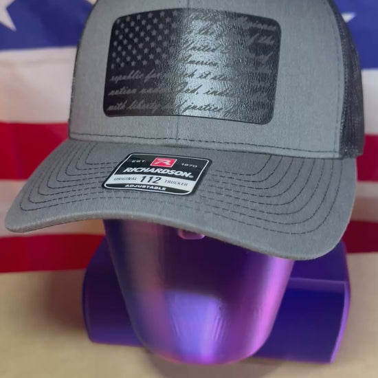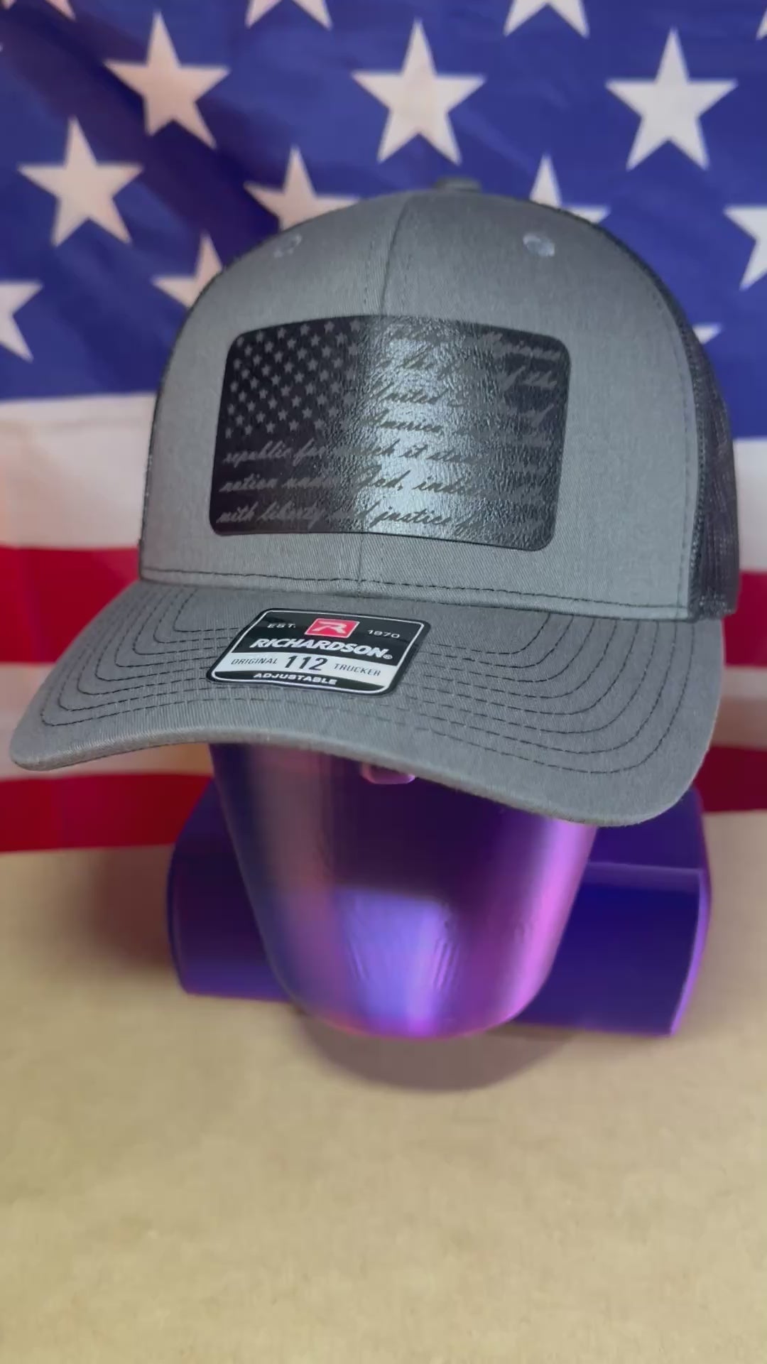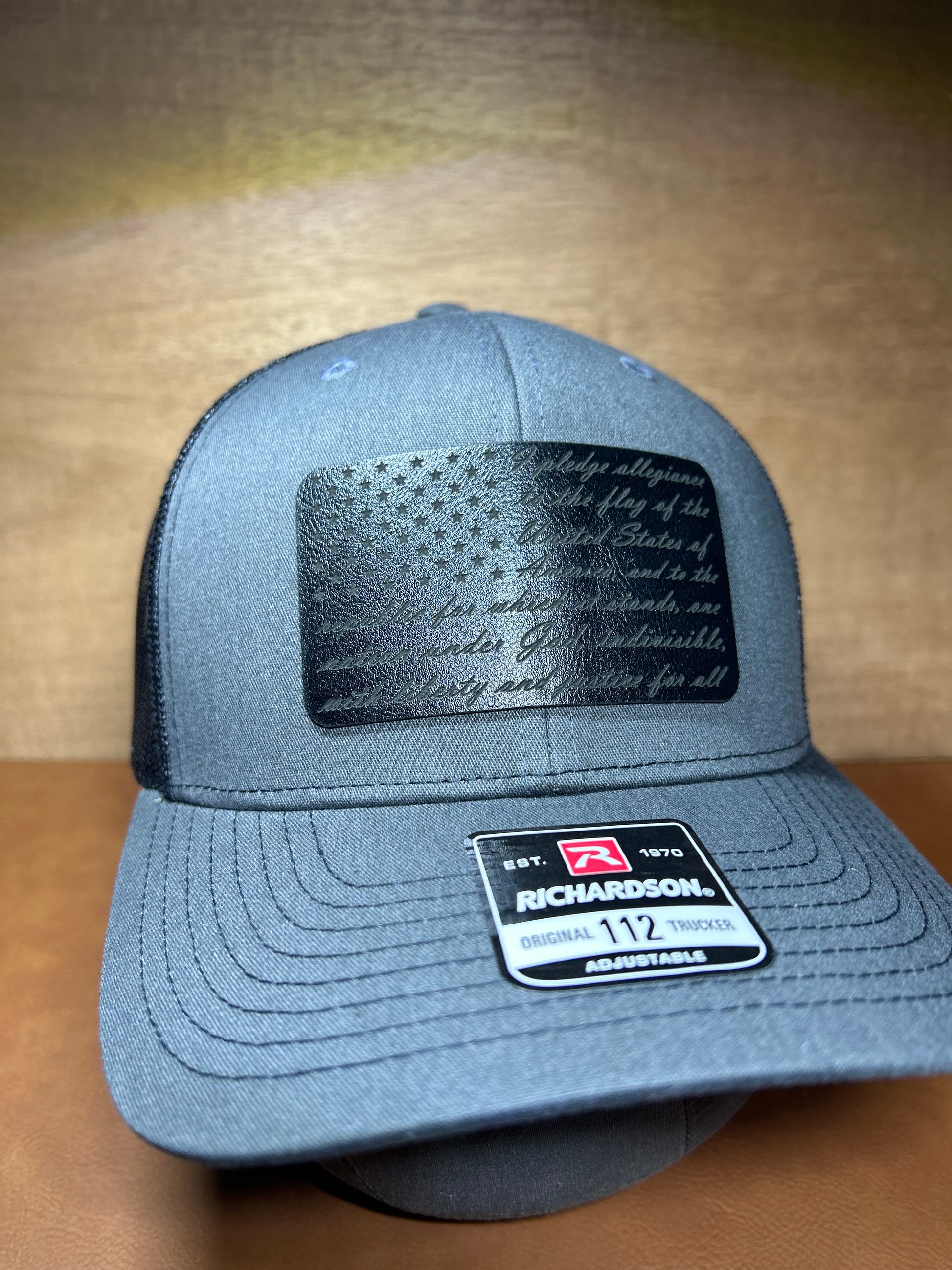 Richardson 112 hat made with the all black patch. Charcoal front with black back is pictured here. This is also available in the black front with charcoal back.