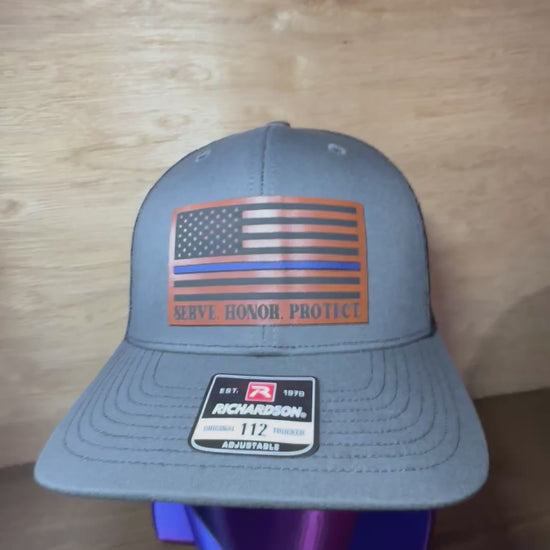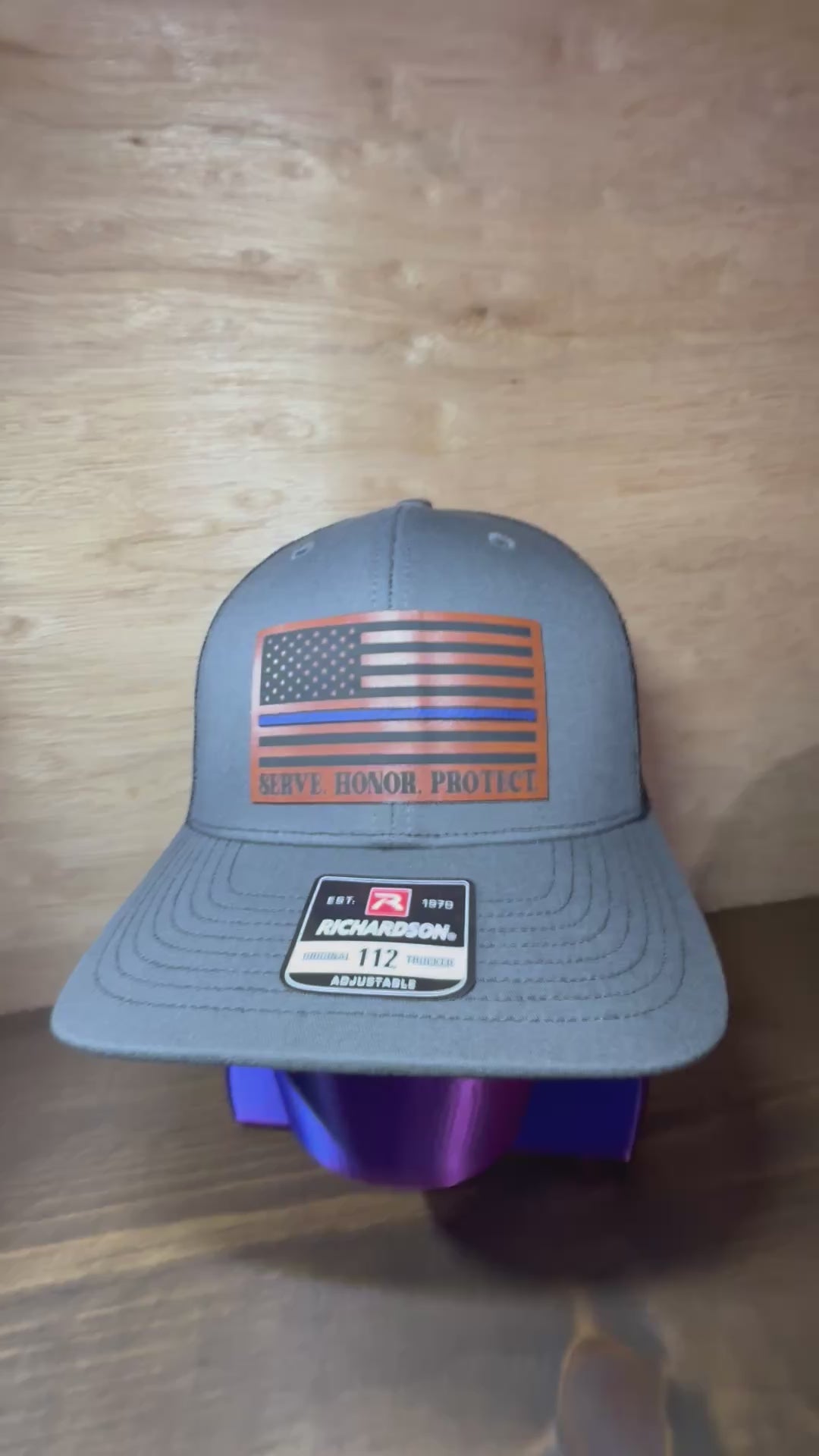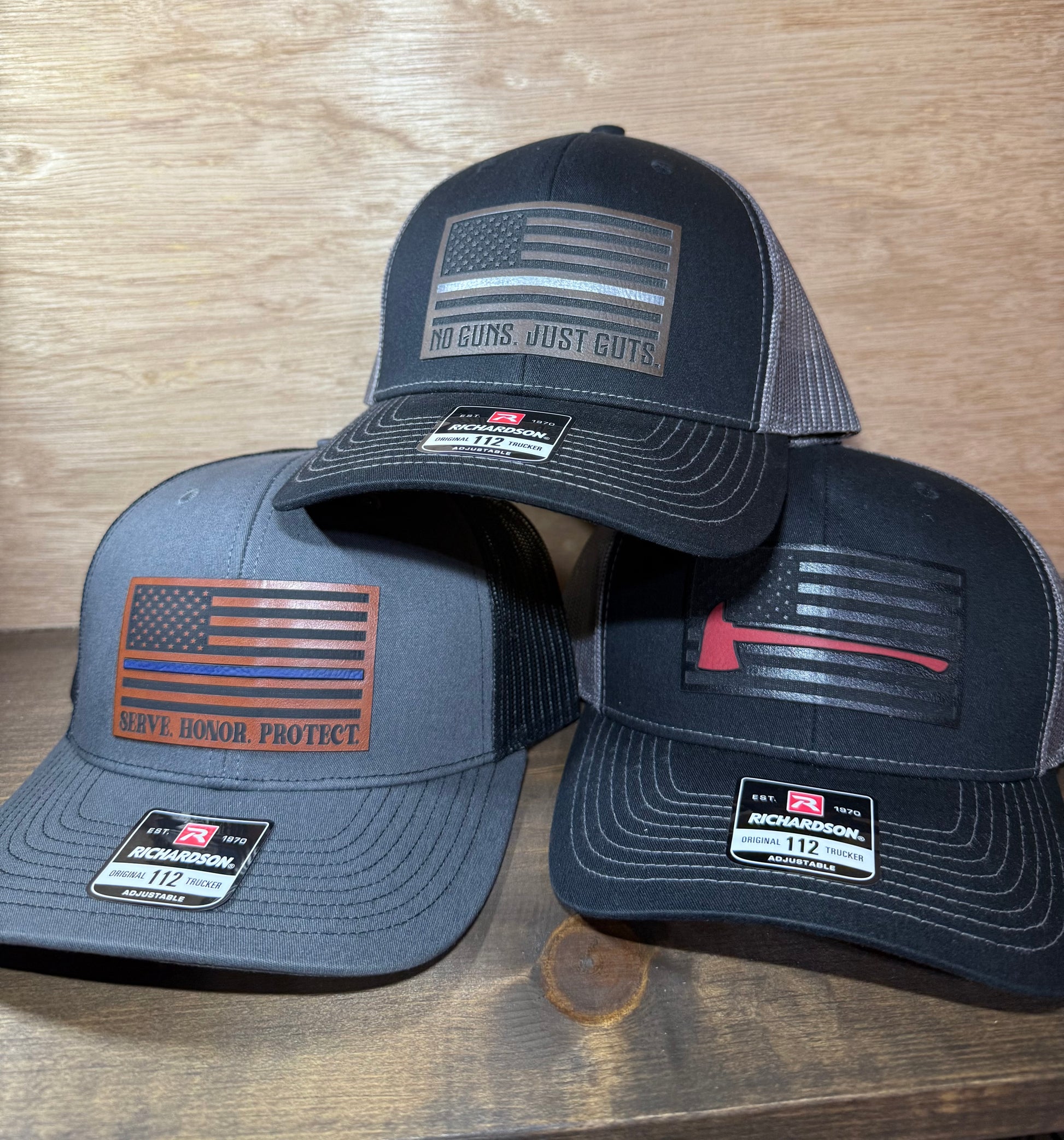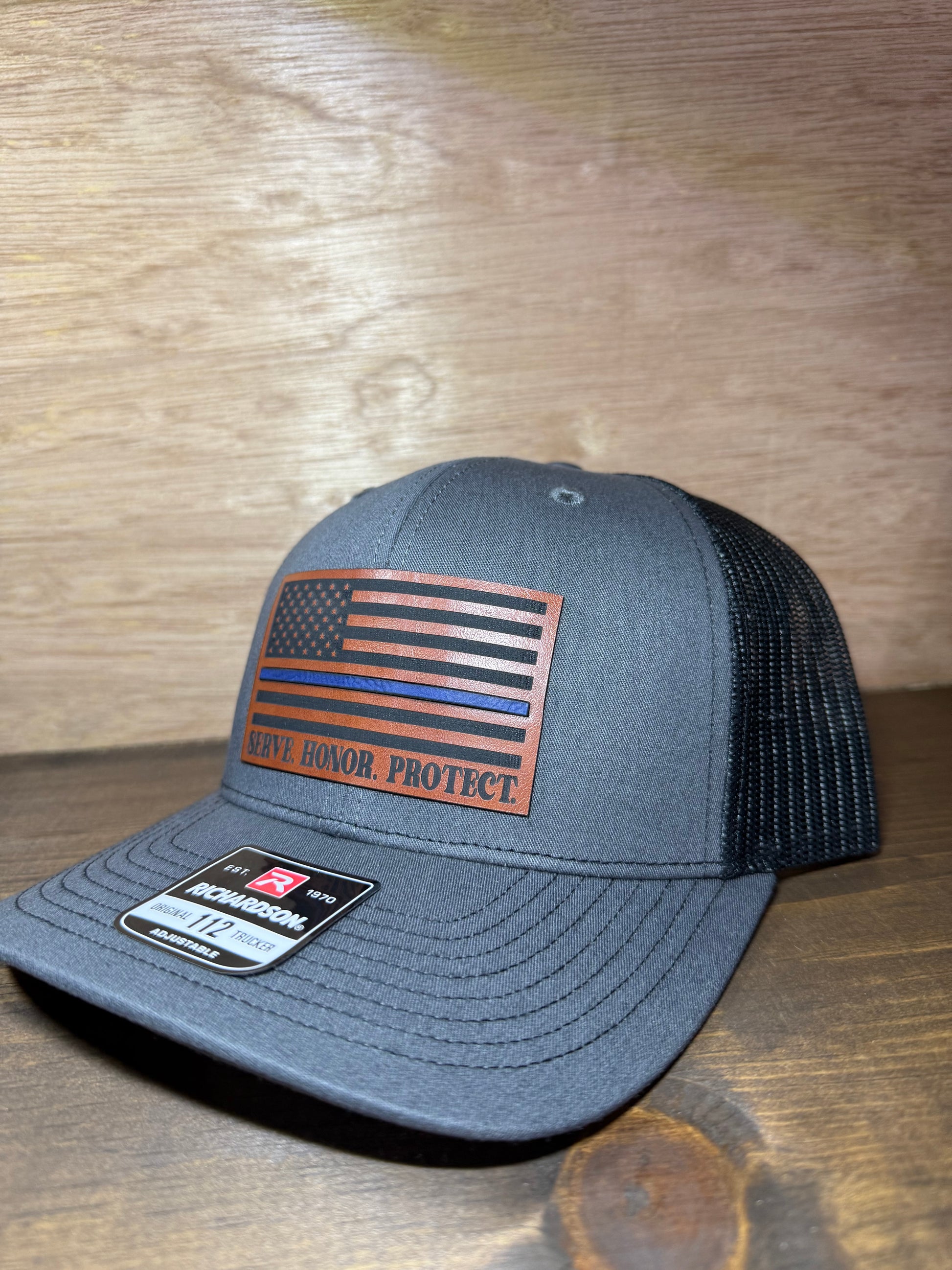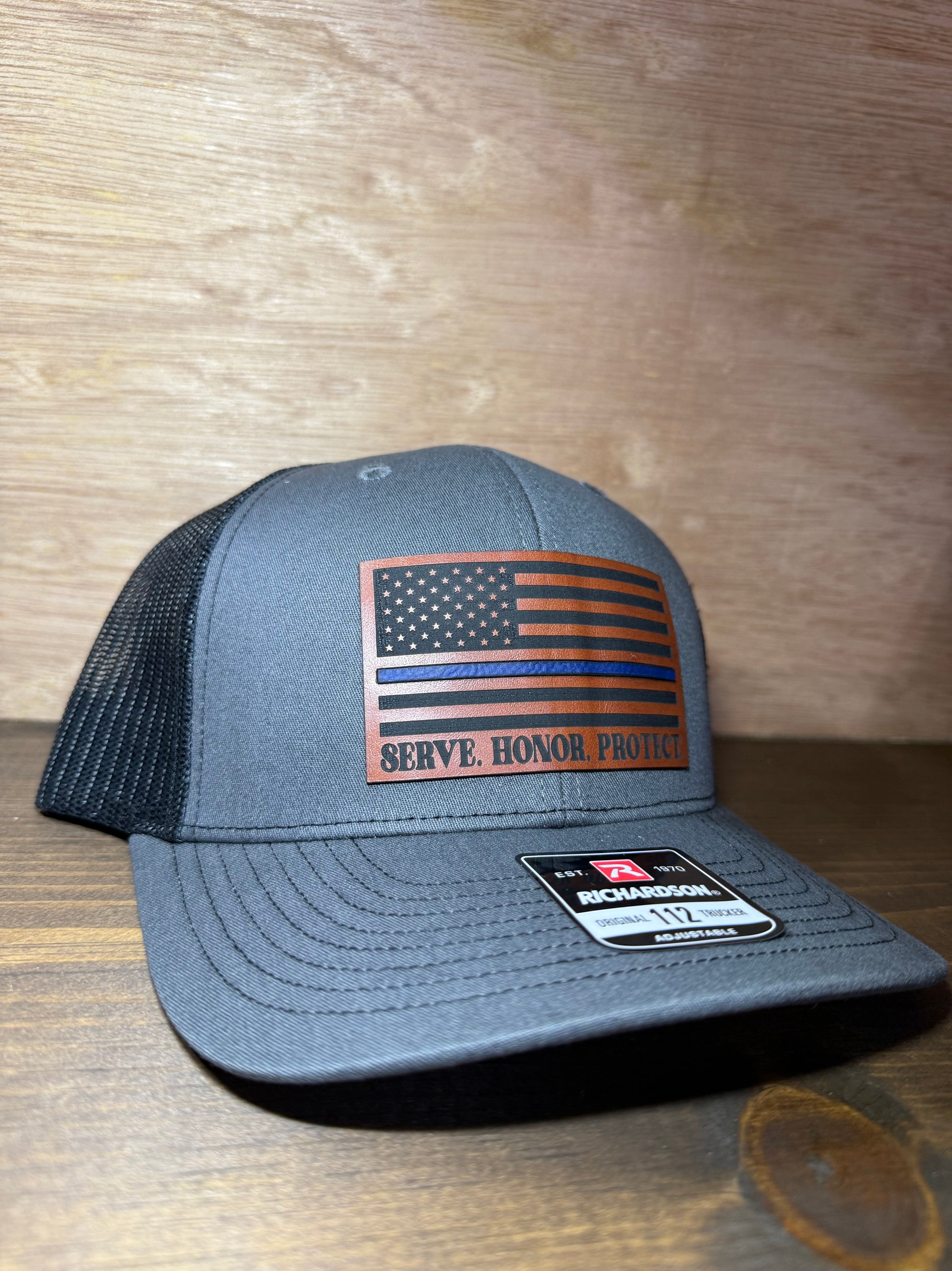Richardson 112 snapback hat, the charcoal front and black back is pictured here. The patch is made of a brown leatherette material and a high-quality adhesive.