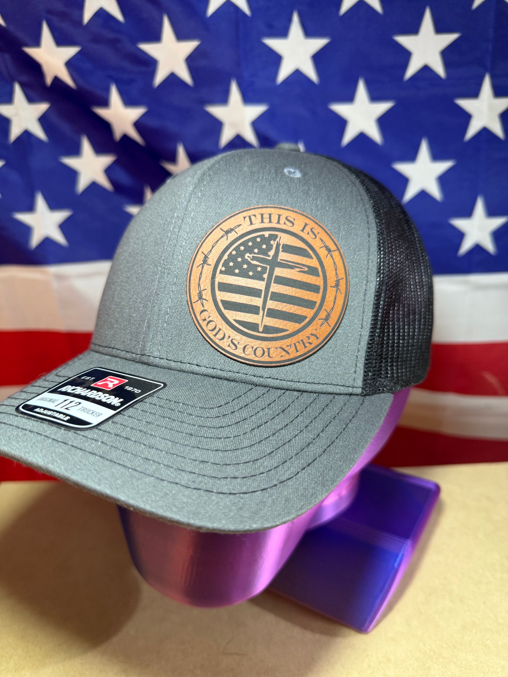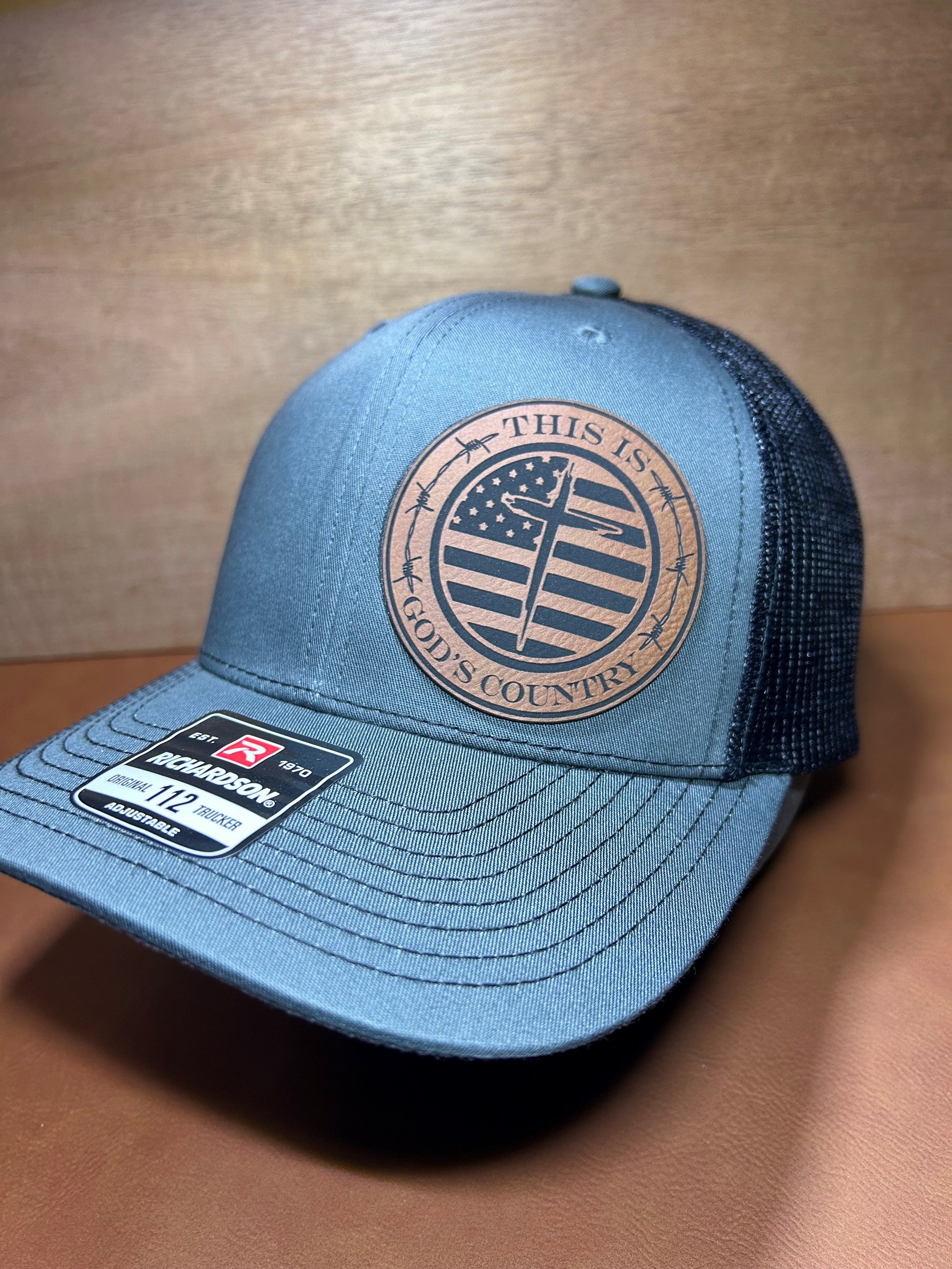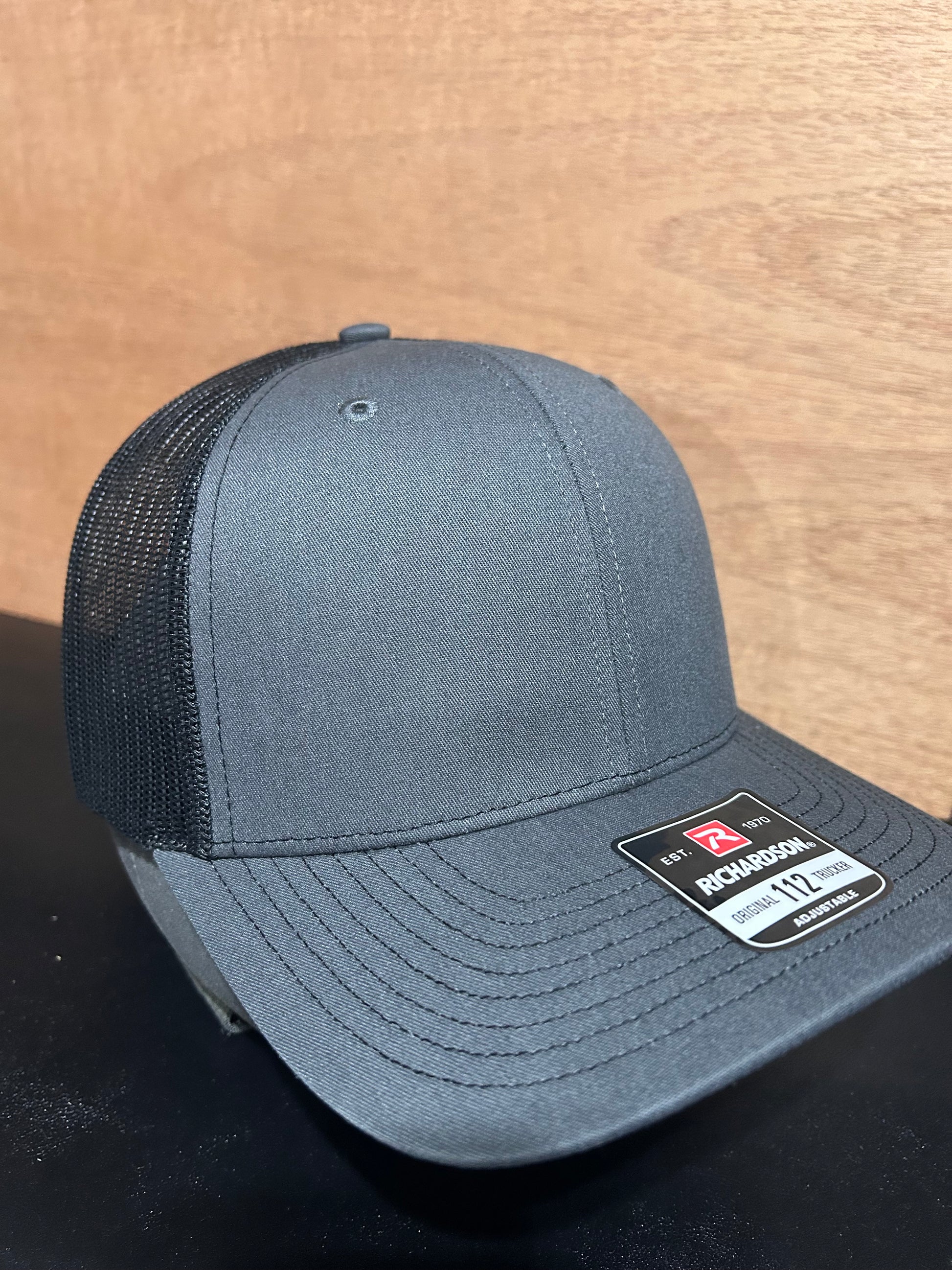 Richardson 112 snapback hat, the charcoal front and black back is pictured here. The patch is made of a brown leatherette material and a high-quality adhesive.