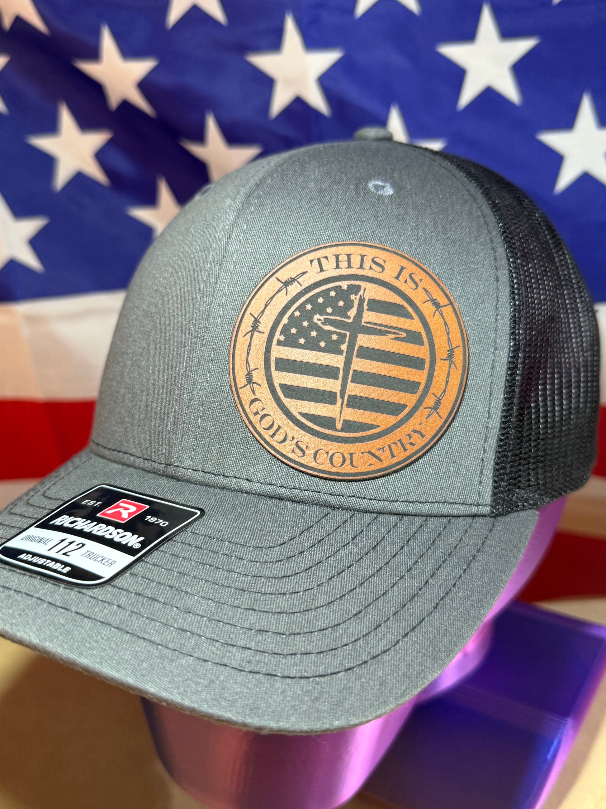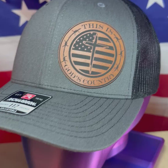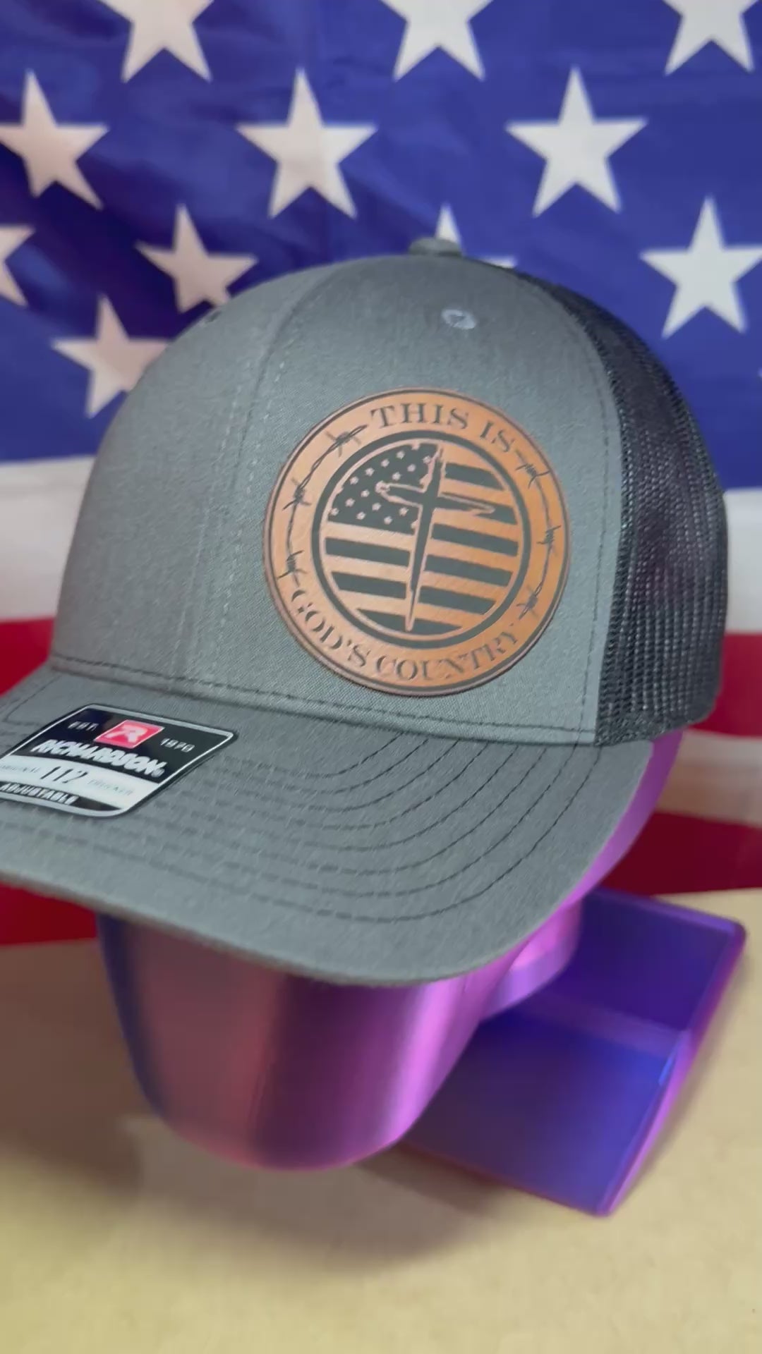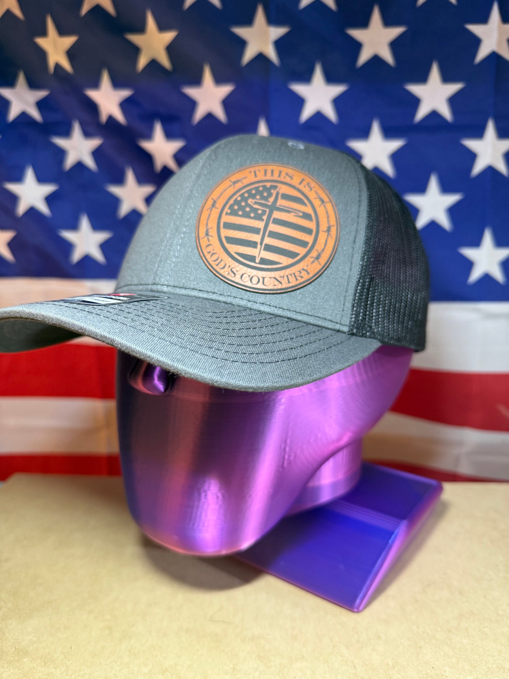 Richardson 112 snapback hat, the charcoal front and black back is pictured here. The patch is made of a brown leatherette material and a high-quality adhesive.