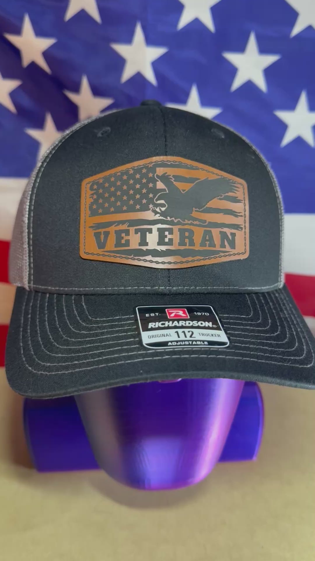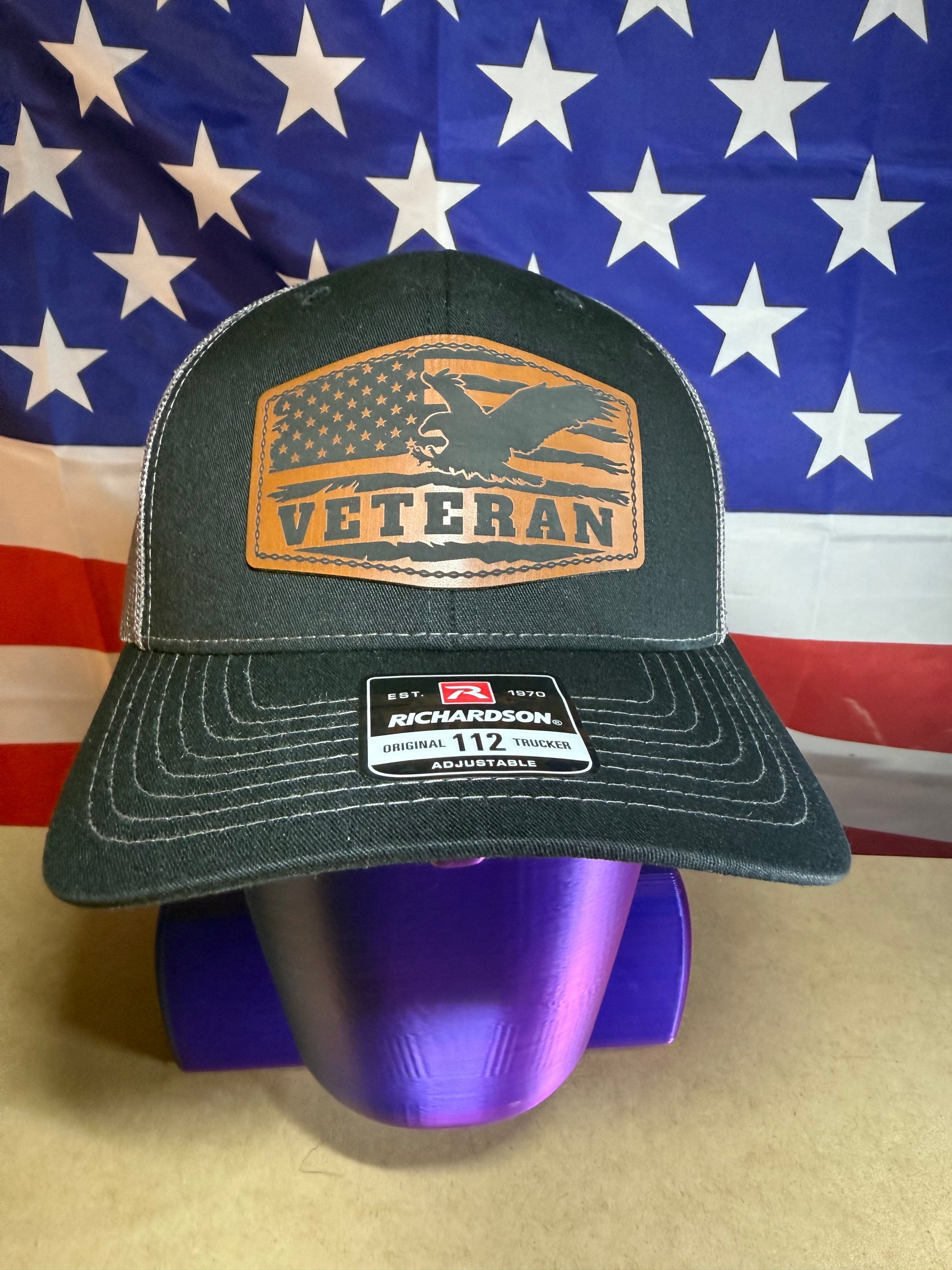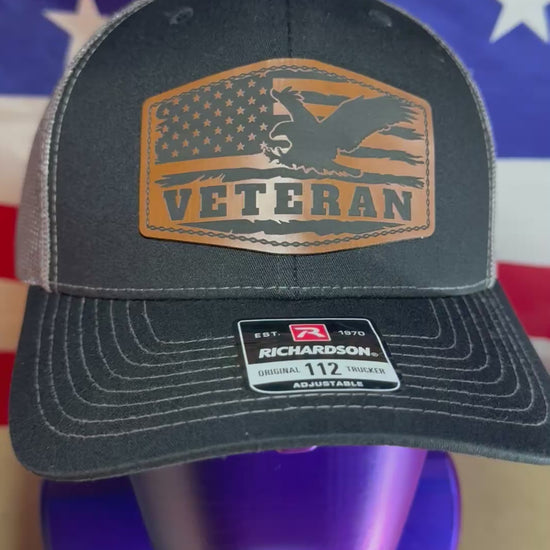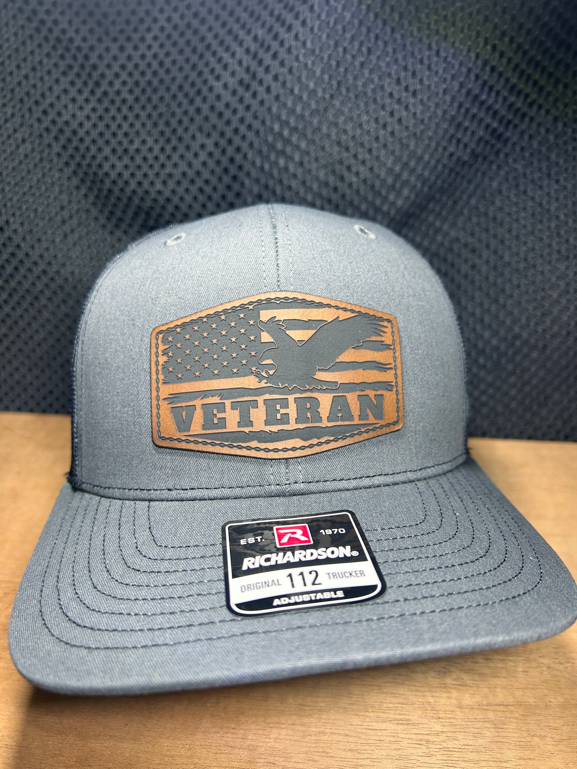 Richardson 112 snapback hat. The patch is made of a brown leatherette material and a high-quality adhesive.
